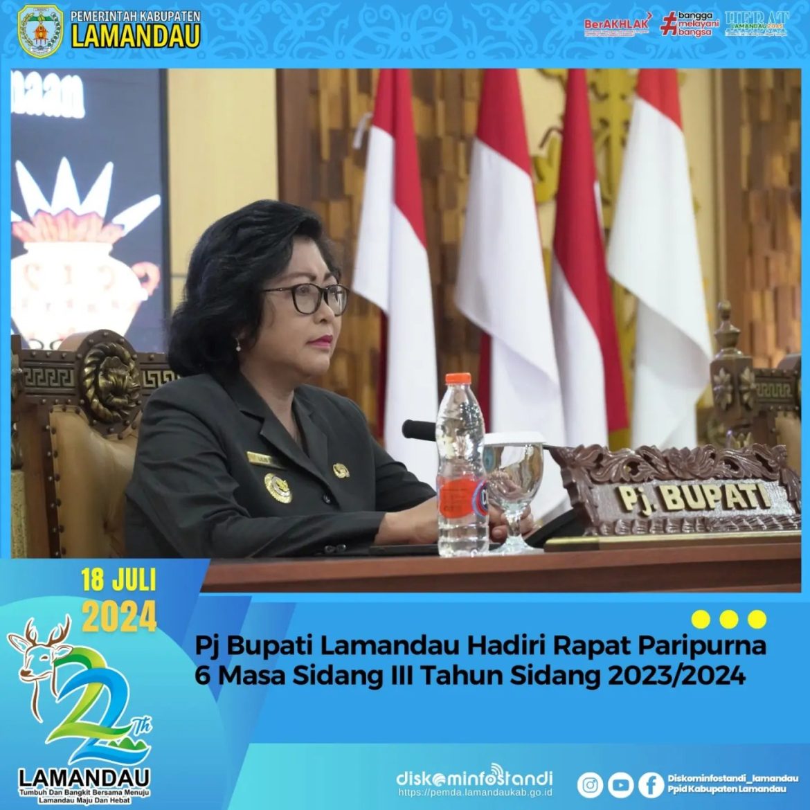 Nanga Bulik – Pj Bupati Lamandau Lilis Suriani menghadiri Rapat Paripurna 6 Masa Sidang III Tahun Sidang 2023/2024, bertempat di Ruang Sidang DPRD Kab. Lamandau, Kamis (18/07).