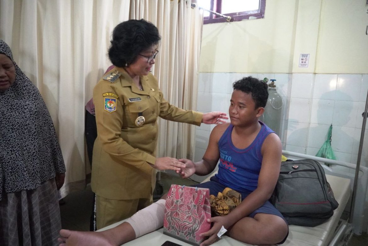 Nanga Bulik – Pj Bupati Lamandau Lilis Suriani mengunjungi korban Kecelakaan lalu lintas yang melibatkan sebuah bus sekolah milik perusahaan PT Menthobi Makmur Lestari (MML) bertabrakan dengan truck tangki pengangkut Crude Palm Oil (CPO) yang juga milik PT MML, Selasa (5/3).