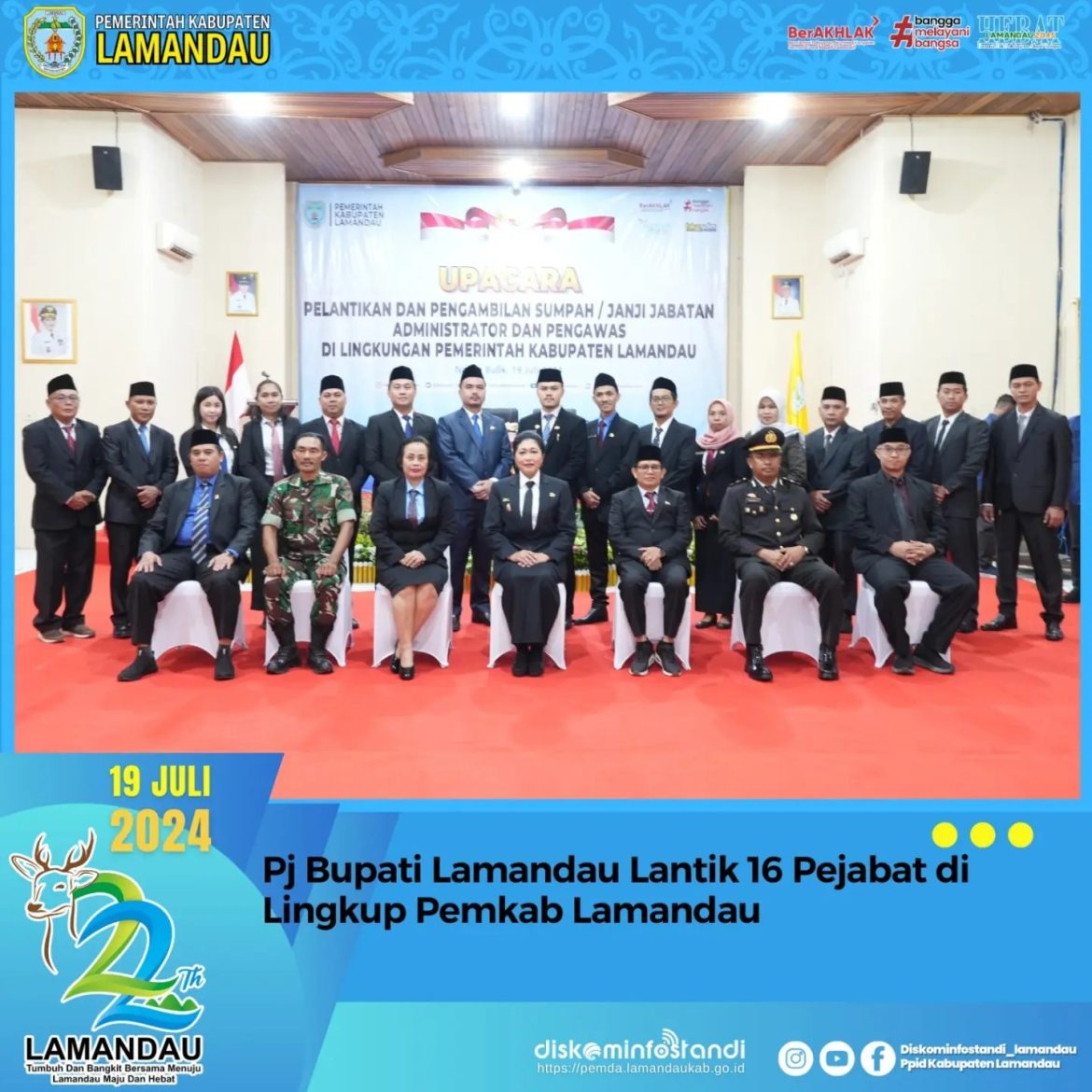 Sebanyak 16 pejabat, yang terdiri dari 8 jabatan Administrator dan 8 pejabat pengawas di lingkungan Pemkab Lamandau telah dilantik dan diambil sumpah janjinya oleh Pj Bupati Lamandau.