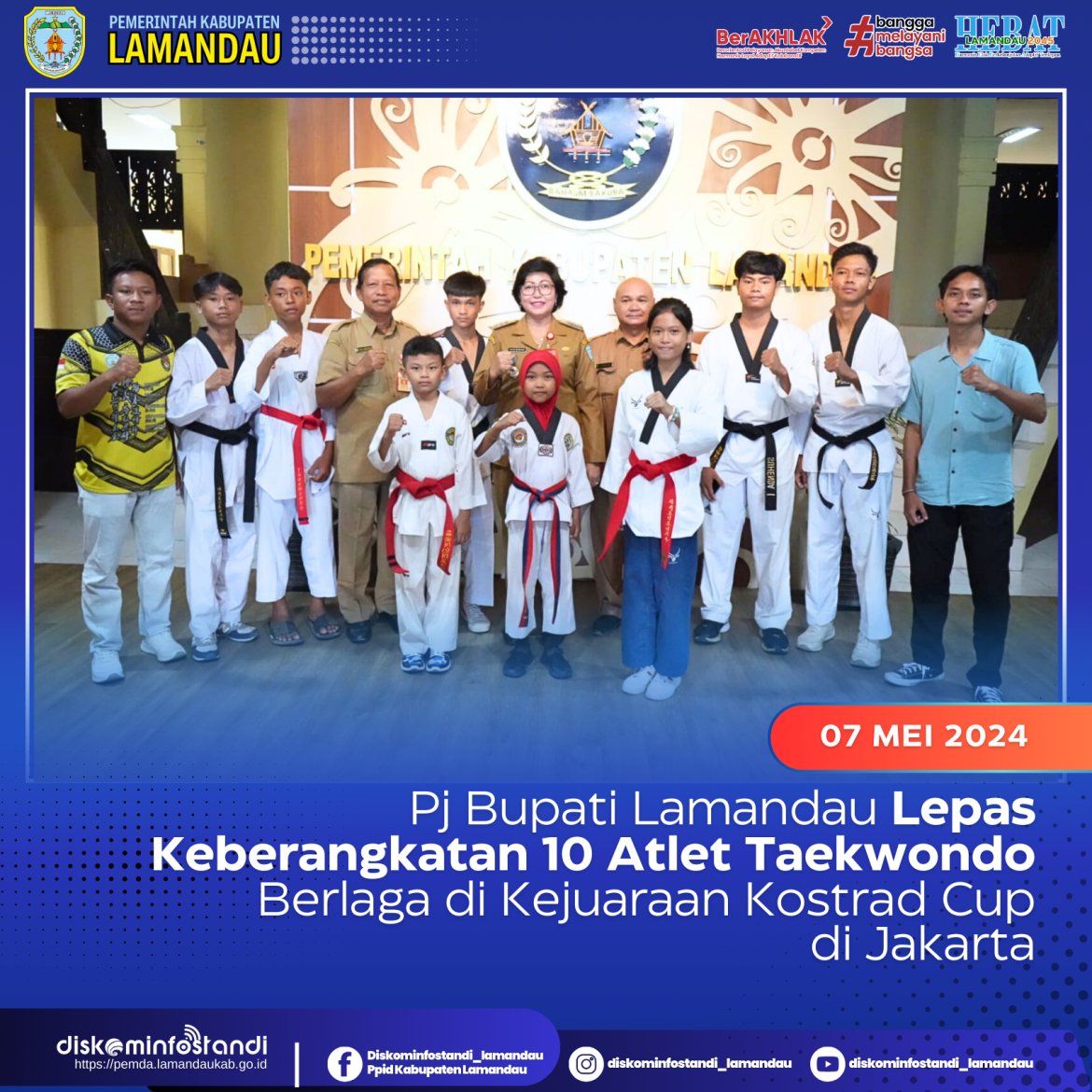 Pj Bupati menambahkan jika pemerintah daerah terus mensupport dan memberikan motivasi kepada para atlet agar dapat bertanding dengan semangat pantang menyerah dan membawa prestasi bagi Kabupaten Lamandau, dan berpesan agar para atlet selalu menjaga kesehatan, pola makan, pola tidur dan memiliki jiwa pemenang serta fokus saat bertanding agar hasil terbaik akan dapat diraih nantinya. Diketahui bahwa Kabupaten Lamandau memberangkatkan sebanyak 10 atlet dan 3 official, terdiri dari 8 atlet akana turun pada nomor Kyorugi prestasi dan 2 atlet bertanding di Poomsae prestasi. (Diskominfostandi)