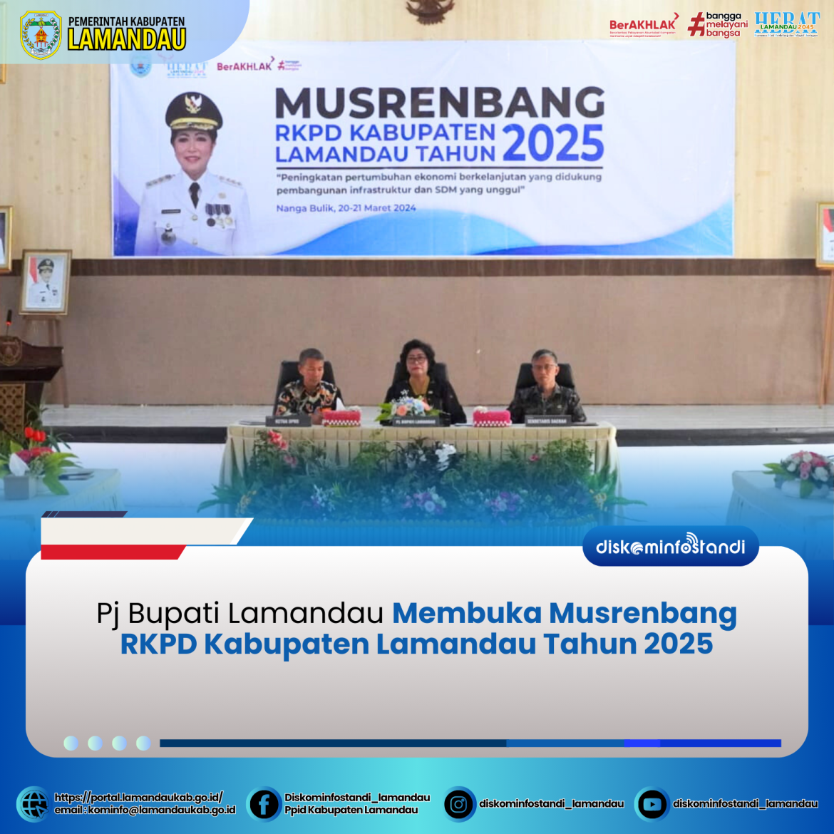 “Peningkatan pertumbuhan ekonomi berkelanjutan yang didukung pembangunan infrastruktur dan SDM yang unggul”, menjadi tema pada Musrenbang yang dihadiri oleh Kepala Bappedalitbang Provinsi Kalimantan Tengah secara virtual, Ketua DPRD Kabupaten Lamandau, Sekda Kabupaten Lamandau, Kepala OPD di lingkup Pemerintahan Kabupaten Lamandau,  pimpinan instansi vertikal, perwakilan perguruan tinggi, swasta, dan undangan lainnya.