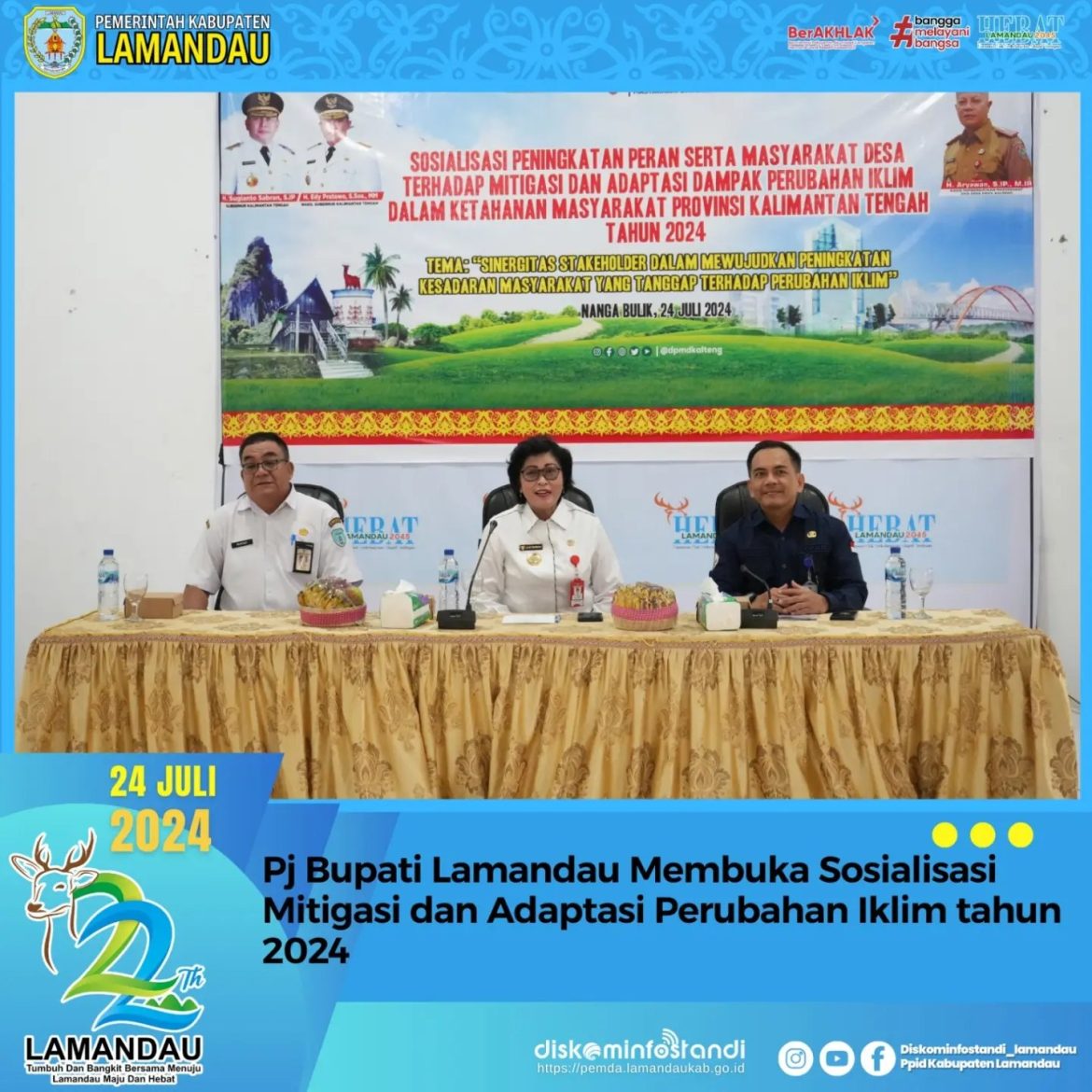 Nanga Bulik – Pj Bupati Lamandau Lilis Suriani membuka giat sosialisasi peningkatan peran serta masyarakat desa terhadap mitigasi dan adaptasi dampak perubahan iklim dalam ketahanan masyarakat Provinsi Kalimantan Tengah, tahun 2024, yang diselenggarakan oleh Dinas Pemberdayaan Masyarakat dan Desa (DPMD) Provinsi Kalimantan Tengah bersama DPMD Kabupaten Lamandau, di aula Kantor Kecamatan Bulik, Rabu (25/7).