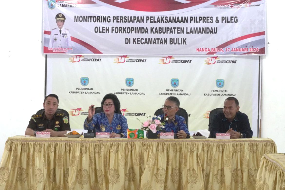 Nanga Bulik – Penjabat (Pj) Bupati Lamandau, Lilis Suriani bersama Forkopimda dan Sekretaris Daerah melaksanakan monitoring persiapan pelaksanaan Pemilihan Presiden (Pilpres) dan Pemilihan Legislatif (Pileg) tahun 2024 di Kecamatan Bulik dan Kecamatan Sematu Jaya, Rabu (17/1/2024).