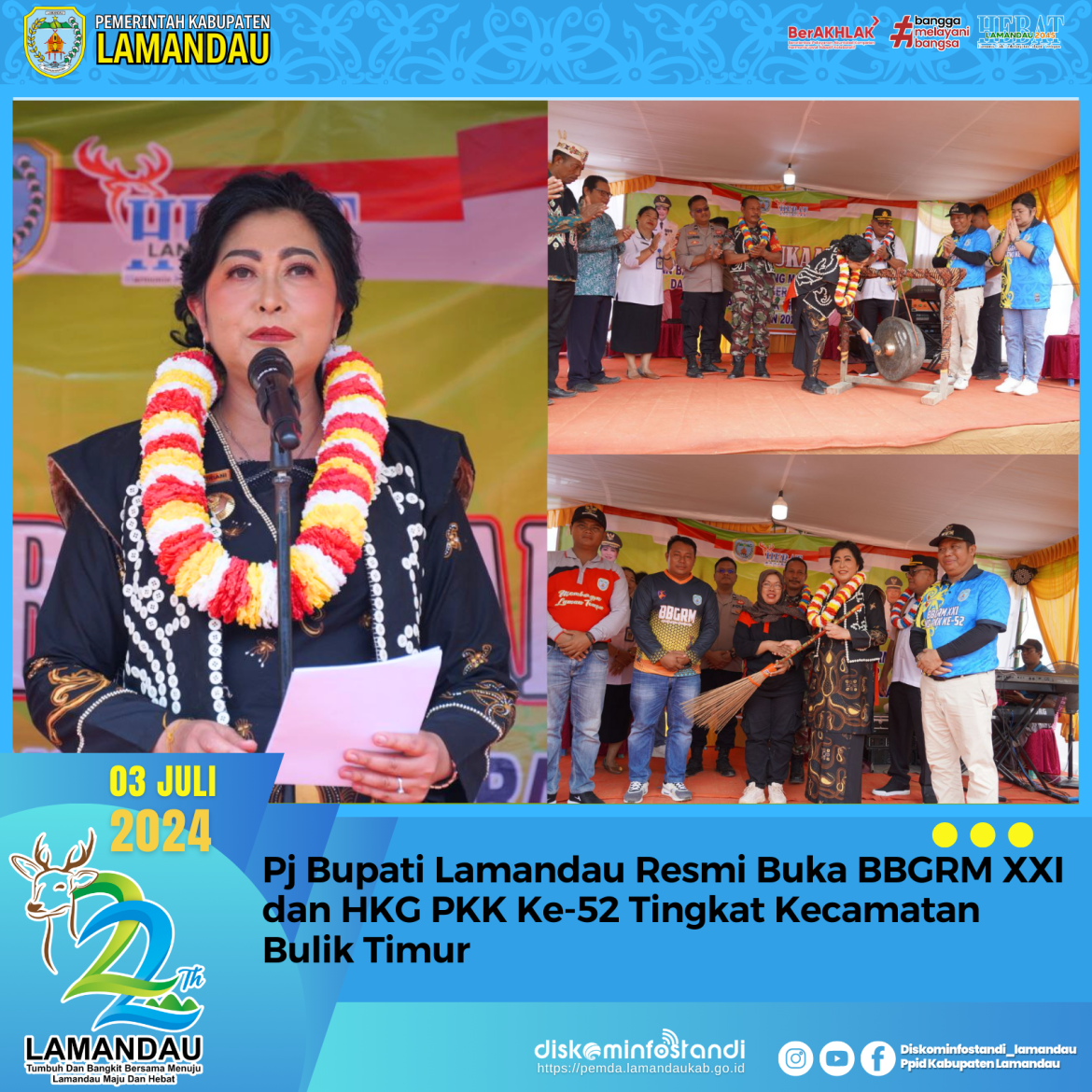 Nuangan – Penjabat (Pj) Bupati Lamandau, Lilis Suriani resmi membuka kegiatan Bulan Bhakti Gotong Royong Masyarakat (BBGRM) XXI, dan Hari Kesatuan Gerak (HKG) PKK Ke-52 Tingkat Kecamatan Bulik Timur, Rabu (3/7).