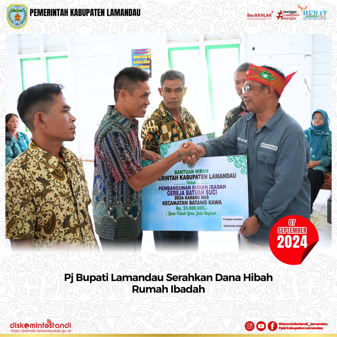 Nanga Bulik – Pj Bupati Lamandau, Said Salim, serahkan bantuan dana hibah kepada rumah ibadah di Kecamatan Batang Kawa, Sabtu (7/9).