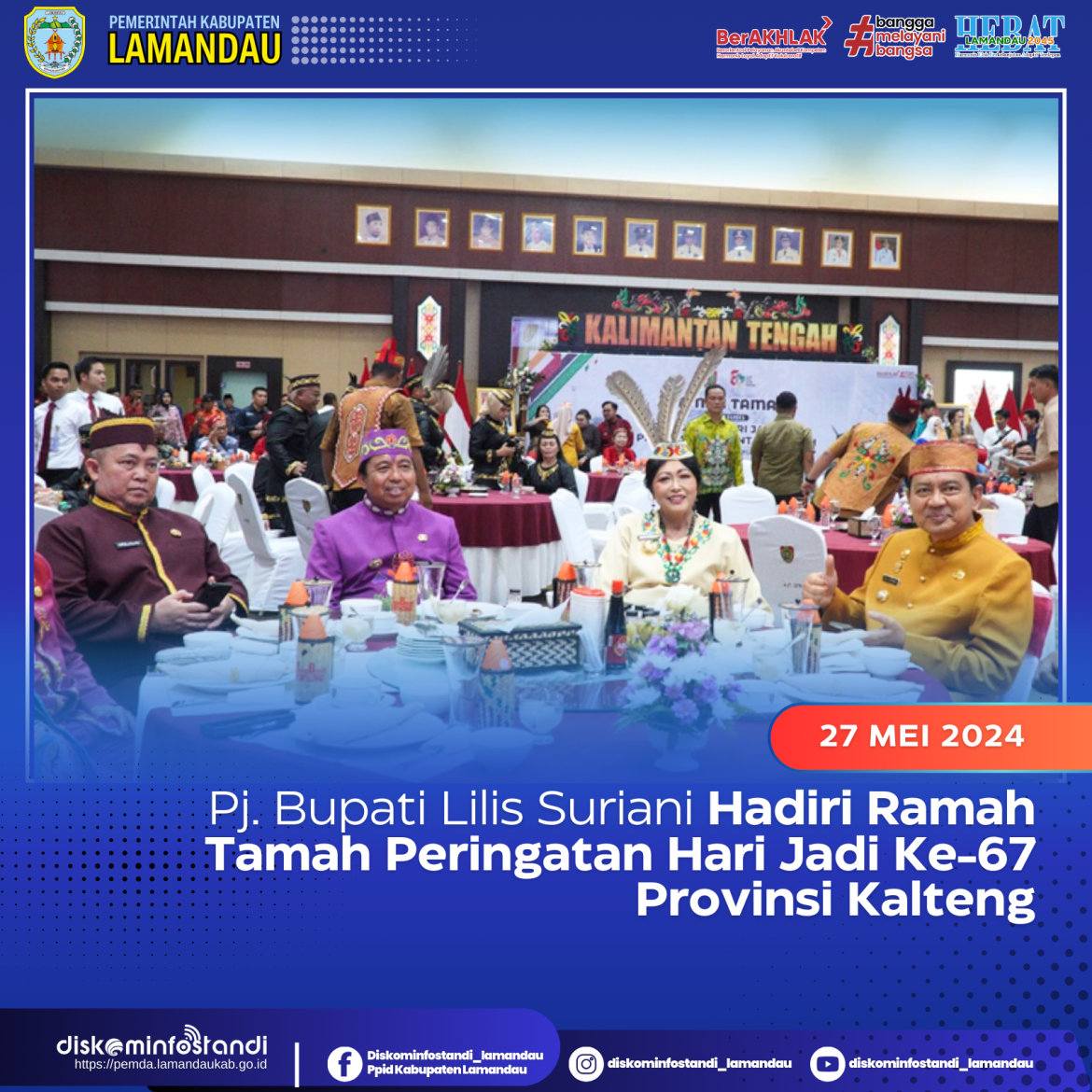 Palangka Raya – Masih dalam rangka Peringatan Hari Jadi ke – 67 Provinsi Kalimantan Tengah (Kalteng), usai mengikuti upacara, Penjabat (Pj) Bupati Lamandau Lilis Suriani juga menghadiri acara ramah tamah yang dilaksanakan di Aula Jayang Tingang, Kantor Gubernur Kalteng, Senin (27/5/2024).