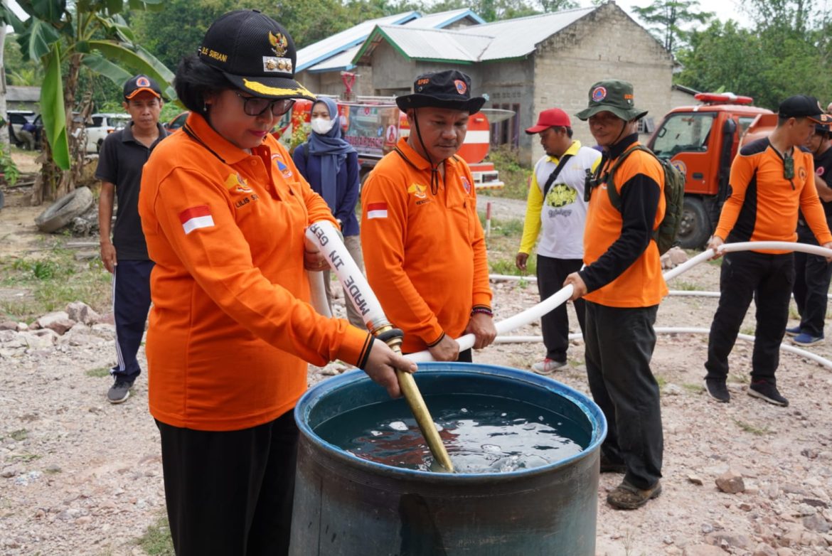 Pj Bupati Lamandau Lilis Suriani di dampingi Ketua BPBD Kabupaten Lamandau, Hendikel, mengunjungi sekaligus menyalurkan secara langsung bantuan air bersih tersebut ke rumah rumah warga.