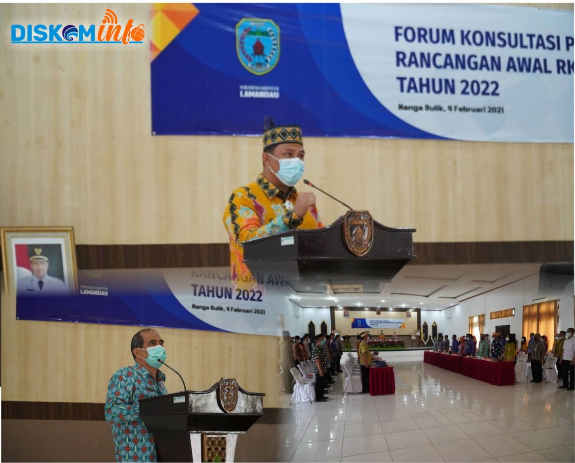 Lamandau – Bupati Lamandau Hendra Lesmana resmi membuka dan memimpin Rapat Forum Konsultasi Publik Rancangan Awal Rencana Kerja Pemerintah Daerah (RKPD) Kabupaten Lamandau Tahun 2022 di Aula Bapeda, kamis (4/2).
