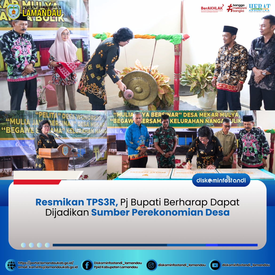 “Besar harapan kita keberadaan TPS3R ini dapat menjadi salah satu sumber ekonomi desa, karena pengolahan sampah yang baik akan menghasilkan pendapatan yang menjanjikan”, kata Pj Bupati. Seperti diketahui, dengan menerapkan inovasi teknologi pengolahan sampah yang baik maka akan menciptakan sejumlah produk diantaranya pupuk organik, budidaya Maggot, pengolahan sampah plastik menjadi biji plastik dan semacamnya, serta produksi lain yang bernilai ekonomi dan dapat di jual kembali. (Diskominfostandi)