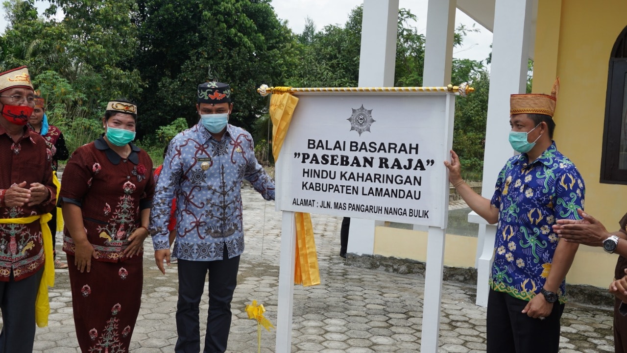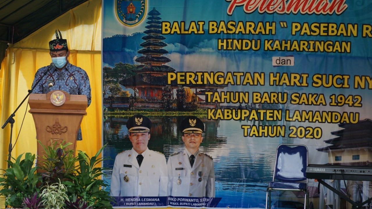 Nanga Bulik – Bupati Lamandau Hendra Lesmana hadir dan meresmikan Rumah Ibadah Agama Hindu Balai Basarah PASEBAN RAJA di jalan Maskaya Pangaruh Nanga Bulik, serta perayaan hari Raya Nyepi 1942 tahun 2020, kamis (24/9). Didampingi Wakil Bupati Riko Porwanto, FORKOPIMDA Kabupaten Lamandau, Kepala OPD, Ketua FKUB, Ketua Organisasi Keagamaan, Tokoh masyarakat, Tokoh Adat, Ketua Majelis Besar Agama Hindu Kaharingan Provinsi Kalimantan Tengah Drs Walter S Penyang, dan hadir pula Rektor Institut Agama Kaharingan Tampung Penyang pusat Palangkaraya.