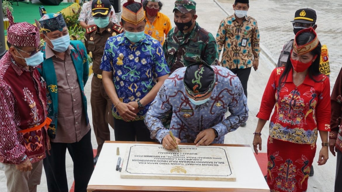 Nanga Bulik – Bupati Lamandau Hendra Lesmana hadir dan meresmikan Rumah Ibadah Agama Hindu Balai Basarah PASEBAN RAJA di jalan Maskaya Pangaruh Nanga Bulik, serta perayaan hari Raya Nyepi 1942 tahun 2020, kamis (24/9). Didampingi Wakil Bupati Riko Porwanto, FORKOPIMDA Kabupaten Lamandau, Kepala OPD, Ketua FKUB, Ketua Organisasi Keagamaan, Tokoh masyarakat, Tokoh Adat, Ketua Majelis Besar Agama Hindu Kaharingan Provinsi Kalimantan Tengah Drs Walter S Penyang, dan hadir pula Rektor Institut Agama Kaharingan Tampung Penyang pusat Palangkaraya.
