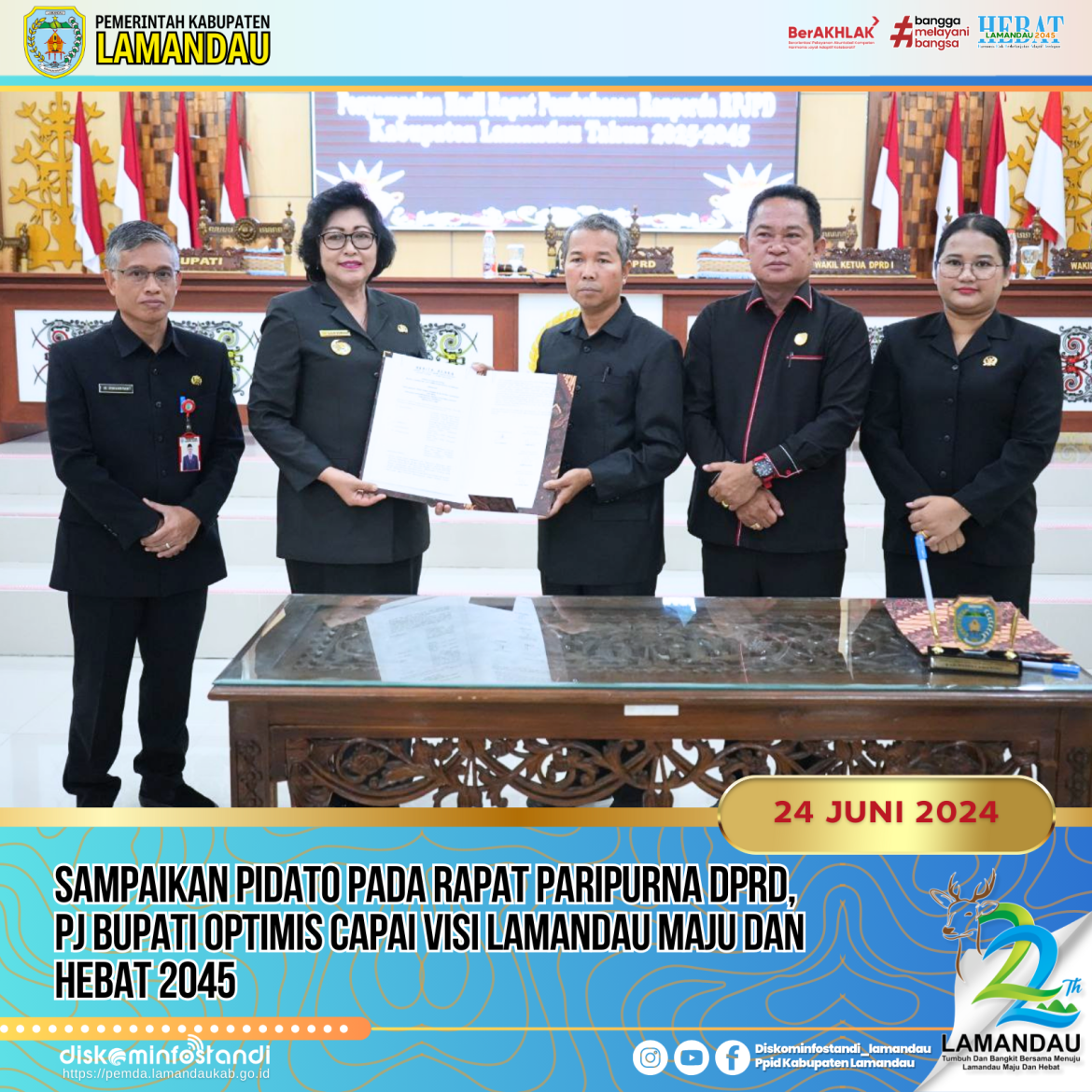 Nanga Bulik – Pj Bupati Lamandau Lilis Suriani menghadiri Rapat Paripurna 4 masa persidangan III tahun sidang 2023/2024 DPRD Kabupaten Lamandau, di Ruang Sidang DPRD Kabupaten Lamandau, Senin (24/6).