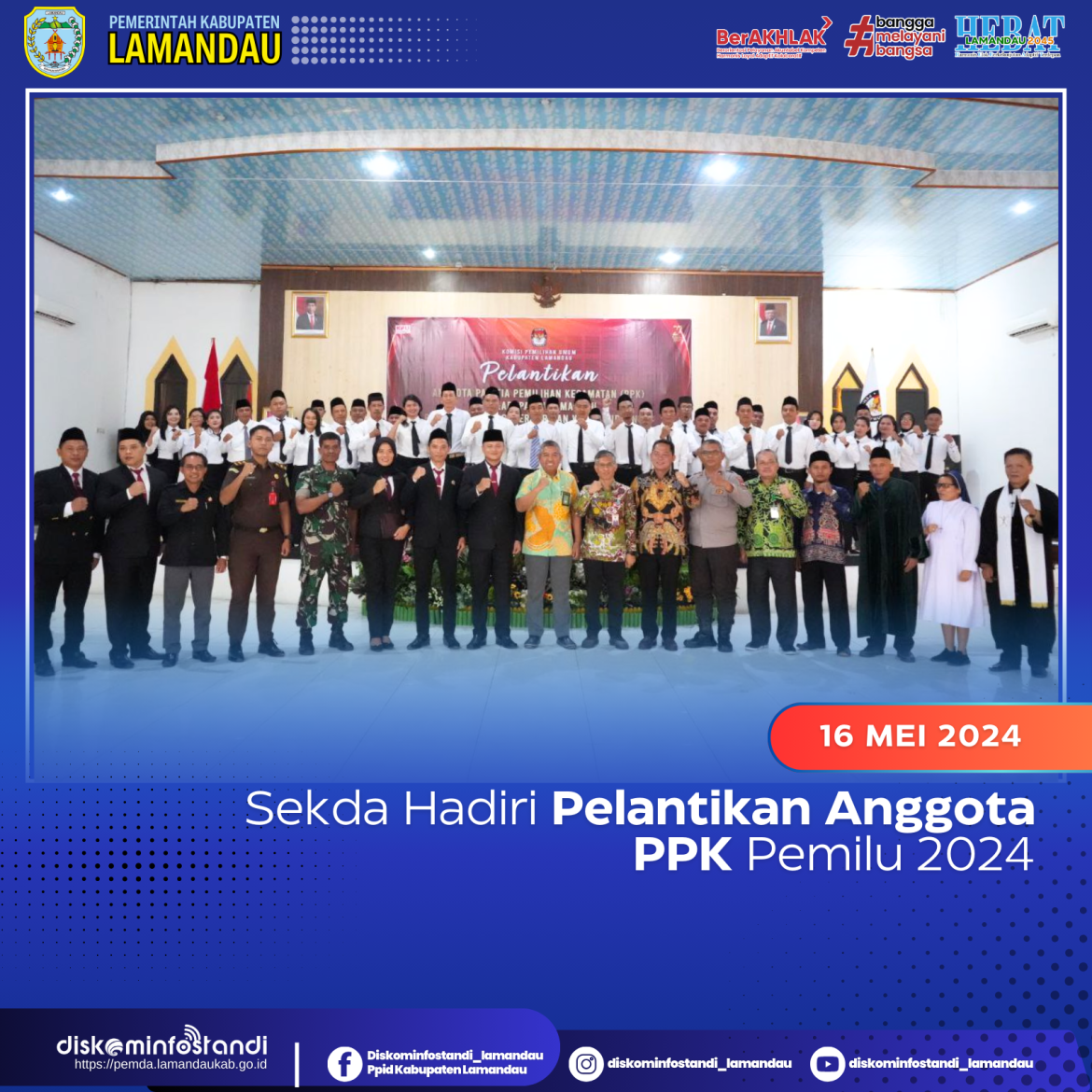 Nanga Bulik – Penjabat (Pj) Bupati Lamandau yang diwakili oleh Sekretaris Daerah, Muhamad Irwansyah menghadiri pelantikan 40 orang anggota Panitia Pemilihan Kecamatan (PPK) pada Pemilihan Umum (Pemilu) Gubernur dan Wakil Gubernur, Bupati dan Wakil Bupati tahun 2024, Kamis (16/5/2024) yang dilaksanakan di Aula Bappedalitbang Lamandau.