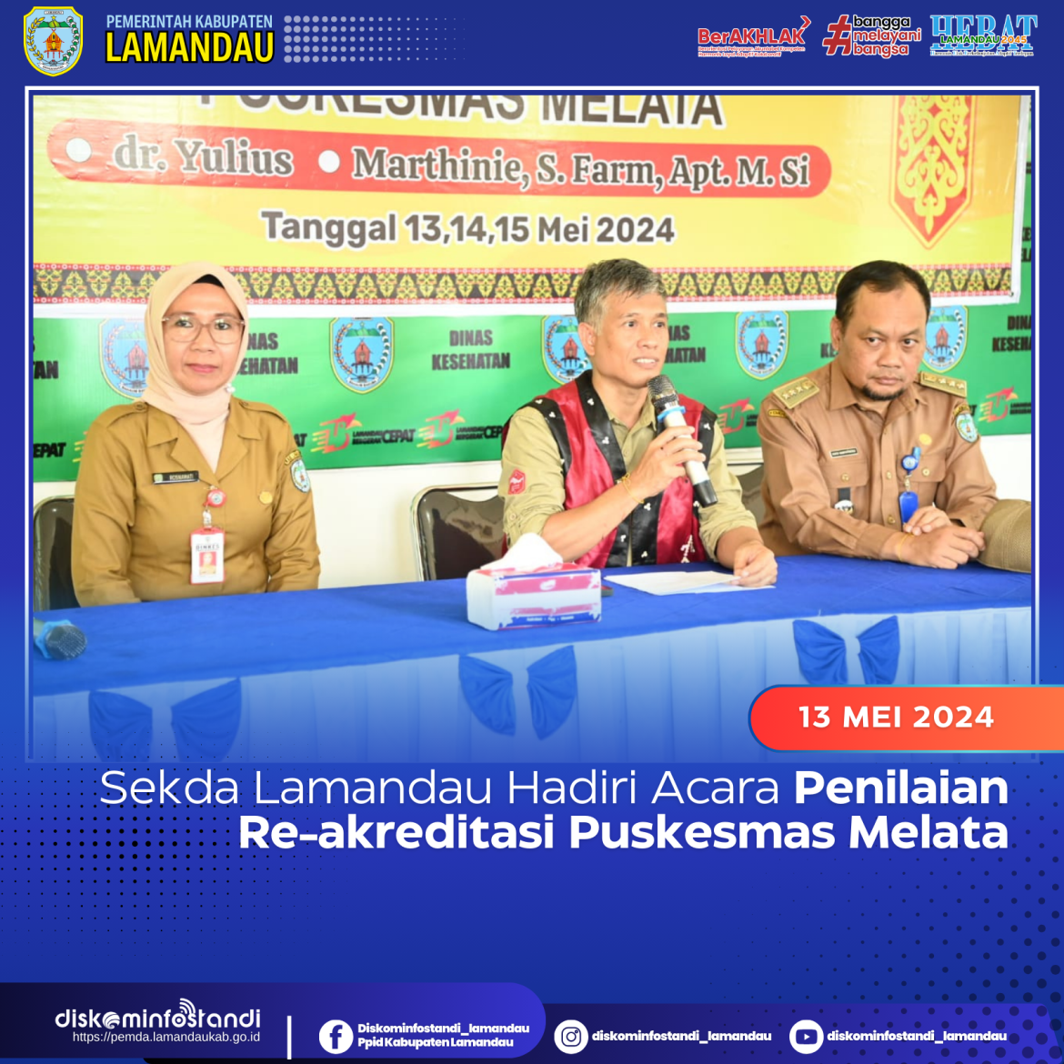 Melata – Sekretaris Daerah Kabupaten Lamandau, Muhamad Irwansyah bersama Kepala Dinas Kesehatan dan Camat Menthobi Raya menghadiri Acara Penilaian Re-akreditasi Puskesmas Melata oleh Tim Surveyor Lafkespri di Desa Melata Kecamatan Menthobi Raya, Senin (13/05/2024).