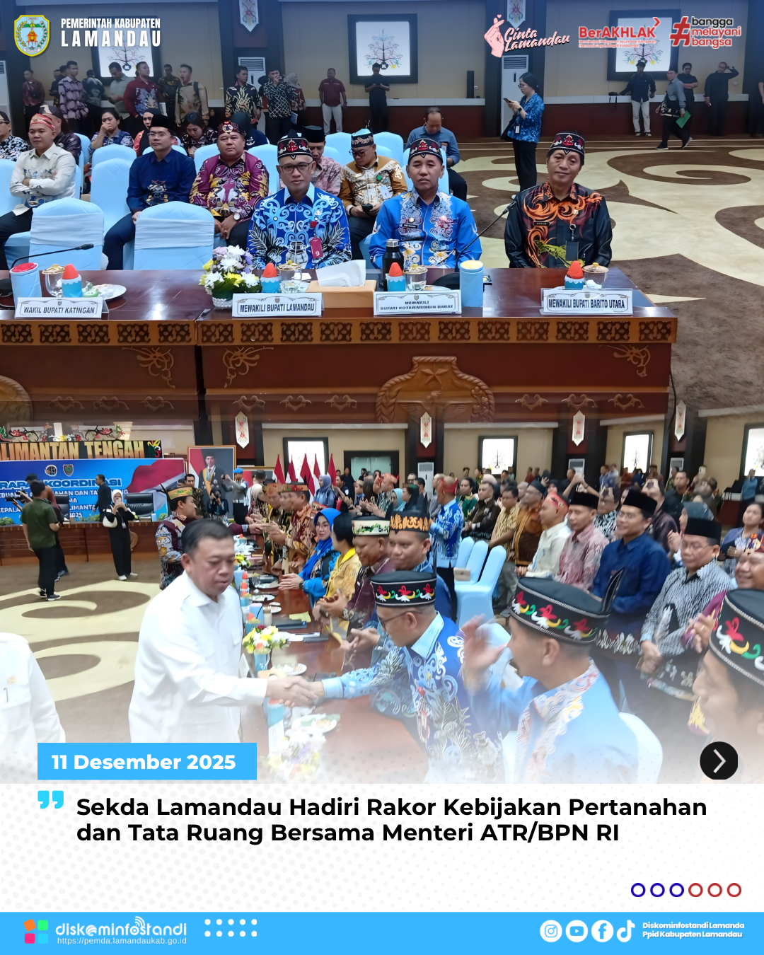 Palangka Raya – Sekretaris Daerah Kabupaten Lamandau, Muhamad Irwansyah, mewakili Bupati Lamandau menghadiri Rapat Koordinasi (Rakor) Kebijakan Pertanahan dan Tata Ruang bersama Menteri Agraria dan Tata Ruang/Kepala Badan Pertanahan Nasional (ATR/BPN) RI, Nusron Wahid, di Aula Jayang Tingang, Kantor Gubernur Kalimantan Tengah, Kamis (11/12/2025).