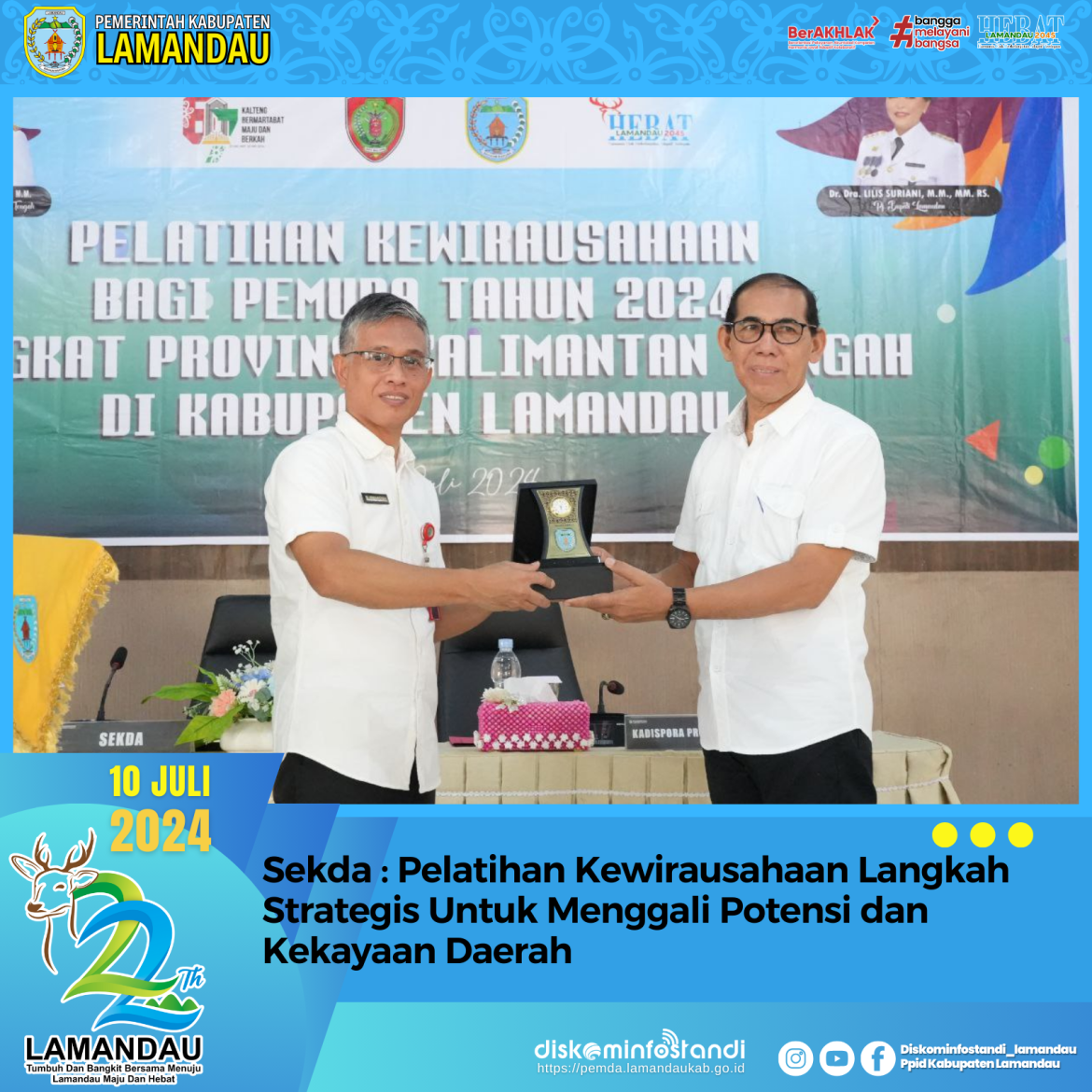 Hal tersebut disampaikan Sekretaris Daerah Kabupaten Lamandau, Muhamad Irwansyah saat mewakili Pj Bupati Lamandau membuka Pelatihan Kewirausahaan bagi pemuda tahun 2024 tingkat Provinsi Kalimantan Tengah, Rabu (10/7/2024) di Aula Bappedalitbang Kabupaten Lamandau.
