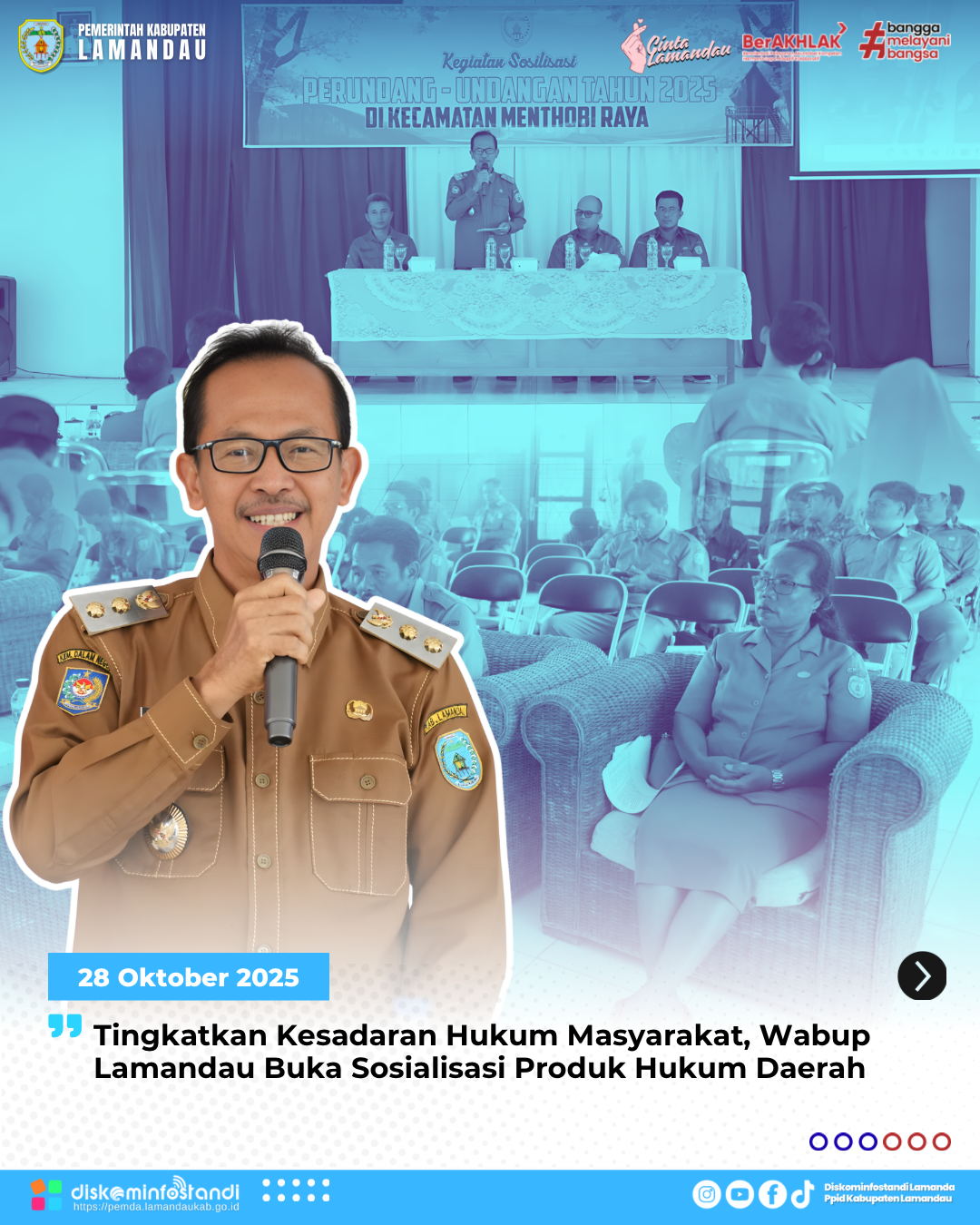 Adapun pada tahun ini, terdapat dua Peraturan Bupati Lamandau yang perlu disosialisasikan, yaitu: Peraturan Bupati Lamandau Nomor 41 Tahun 2025 tentang Gerakan Masyarakat Hidup Sehat (GERMAS), karena dalam peraturan ini, pemerintah daerah menegaskan pentingnya kesehatan sebagai hak dasar dan investasi pembangunan manusia.
