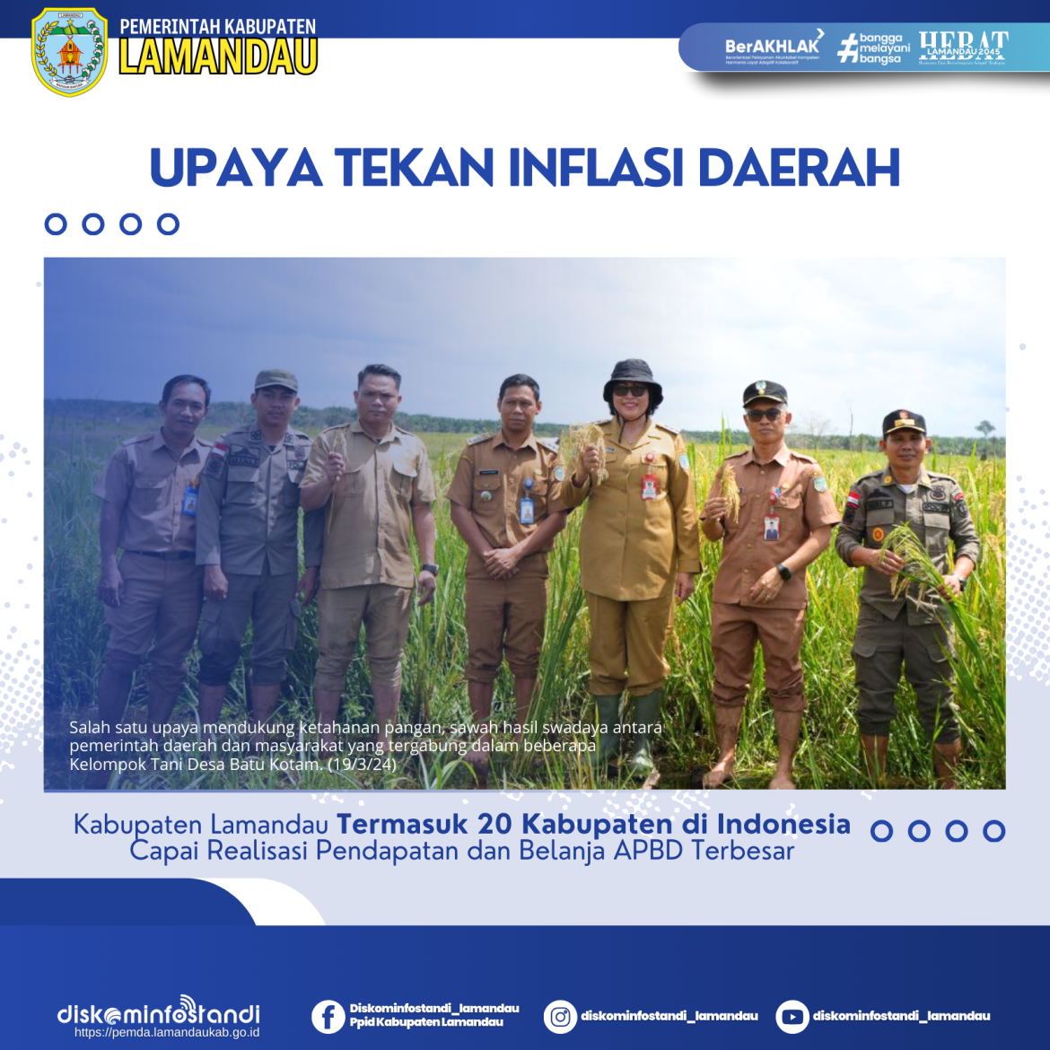 Dari data yang telah dirilis oleh Kemendagri tersebut, Kabupaten Lamandau juga menjadi salah satu dari 20 Kabupaten di Indonesia dengan presentase realisasi pendapatan dan presentase realisasi belanja APBD terbesar. Kemendagri akan terus mendorong Pemda untuk melaksanakan Rakor/Anev Pengendalian Inflasi Daerah sesuai dengan arahan Bapak Presiden RI, serta lebih proaktif dalam melakukan langkah-langkah konkrit pengendalian inflasi daerah. (Diskominfostandi)