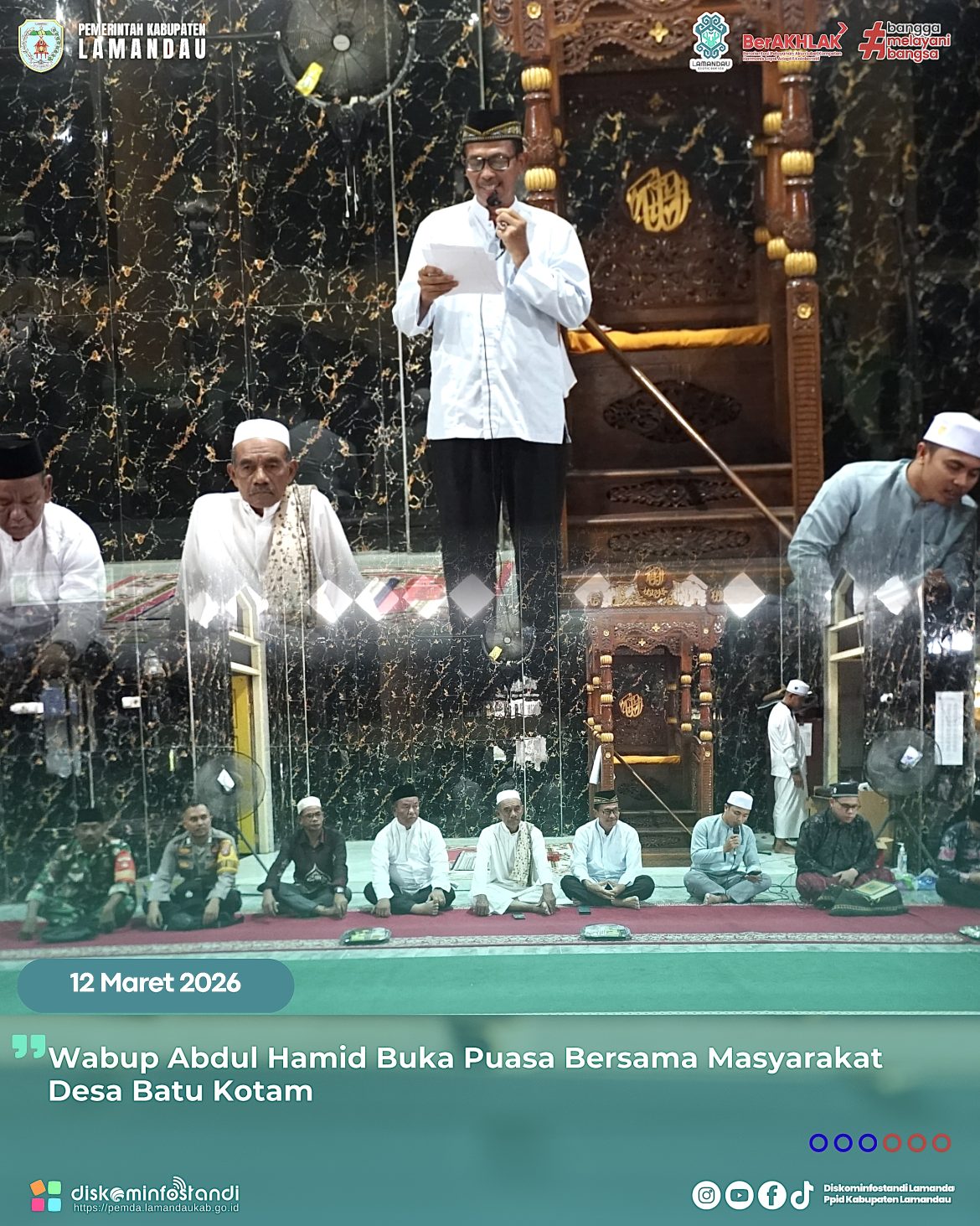 Nanga Bulik – Wakil Bupati Lamandau, Abdul Hamid menghadiri kegiatan kultum dan buka puasa bersama Pemerintah Desa serta masyarakat Desa Batu Kotam, Kamis (12/3/2026), di Masjid Miftahul Khair, Desa Batu Kotam, Kecamatan Bulik.