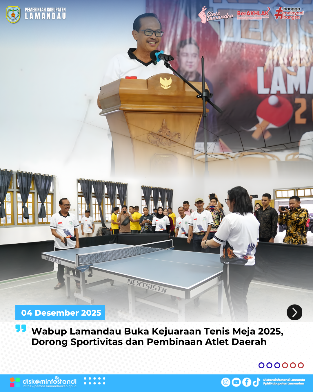 Nanga Bulik — Wakil Bupati Lamandau, Abdul Hamid, resmi membuka Kejuaraan Tenis Meja Kabupaten Lamandau Tahun 2025 yang dipusatkan di Gedung Sembaga Mas, Kamis (4/12). Ajang olahraga ini digelar sebagai ruang pembinaan sekaligus mendorong meningkatnya minat masyarakat terhadap cabang tenis meja.