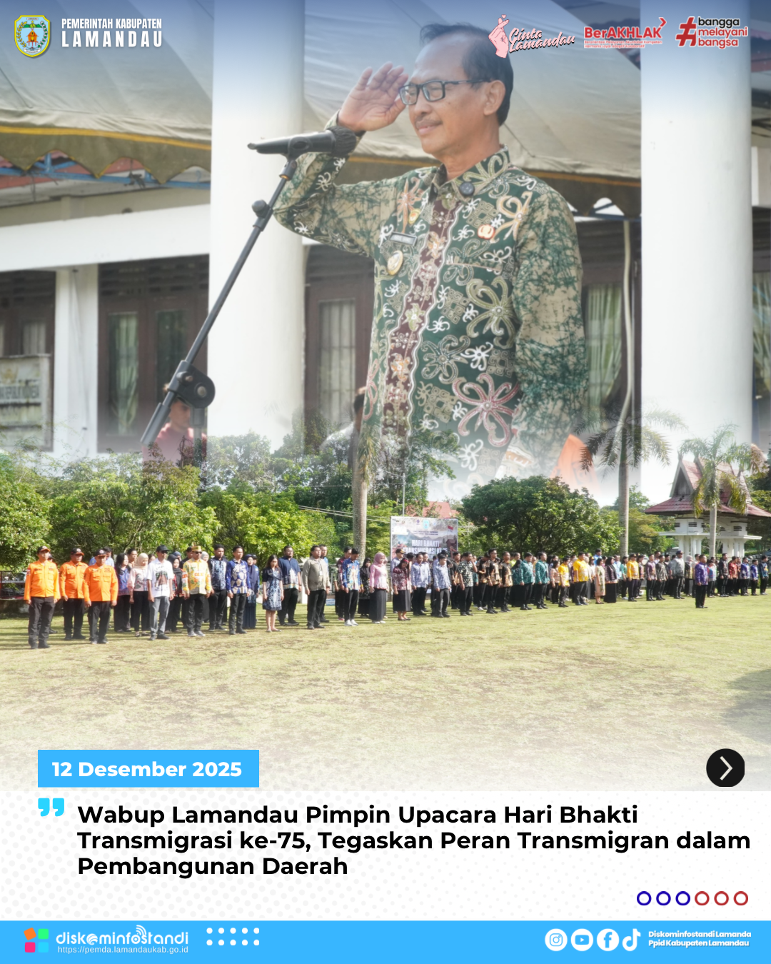 Wabup juga mengapresiasi kepada para transmigran yang telah menetap dan membangun kehidupan baru di Lamandau, serta menegaskan bahwa kontribusi mereka menjadi bagian penting dalam denyut pembangunan daerah.