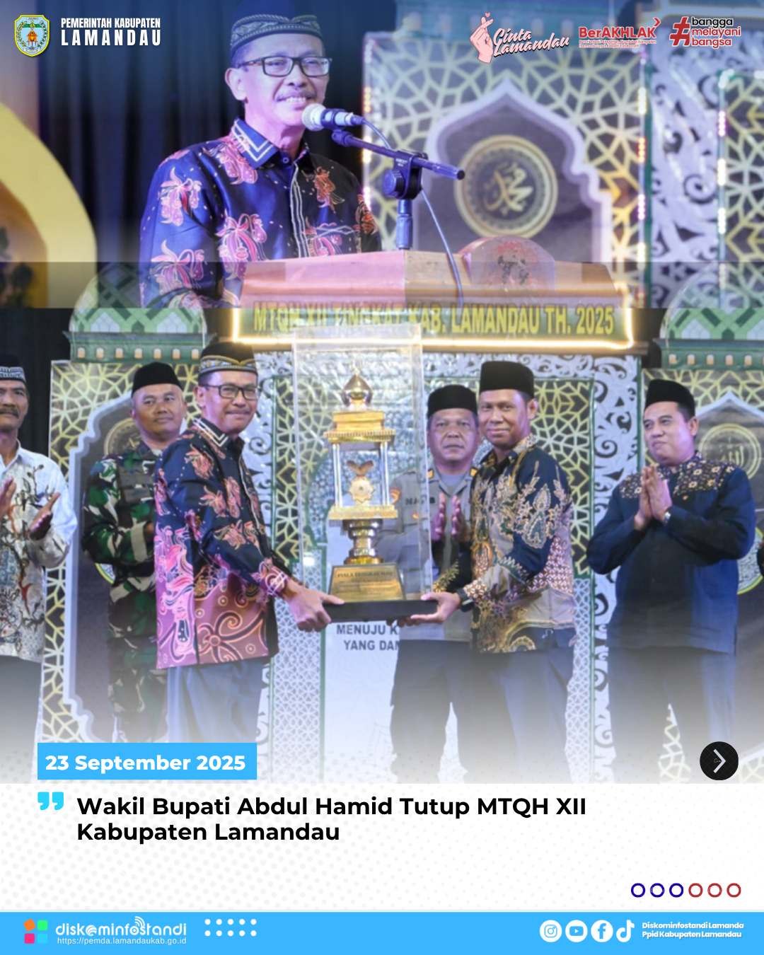 Nanga Bulik – Wakil Bupati (Wabup) Lamandau, Abdul Hamid, secara resmi menutup Musabaqah Tilawatil Qur’an dan Hadits (MTQH) XII tingkat Kabupaten Lamandau tahun 2025 yang berlangsung di GPU Lantang Torang, Nanga Bulik, Selasa malam (23/9/2025).