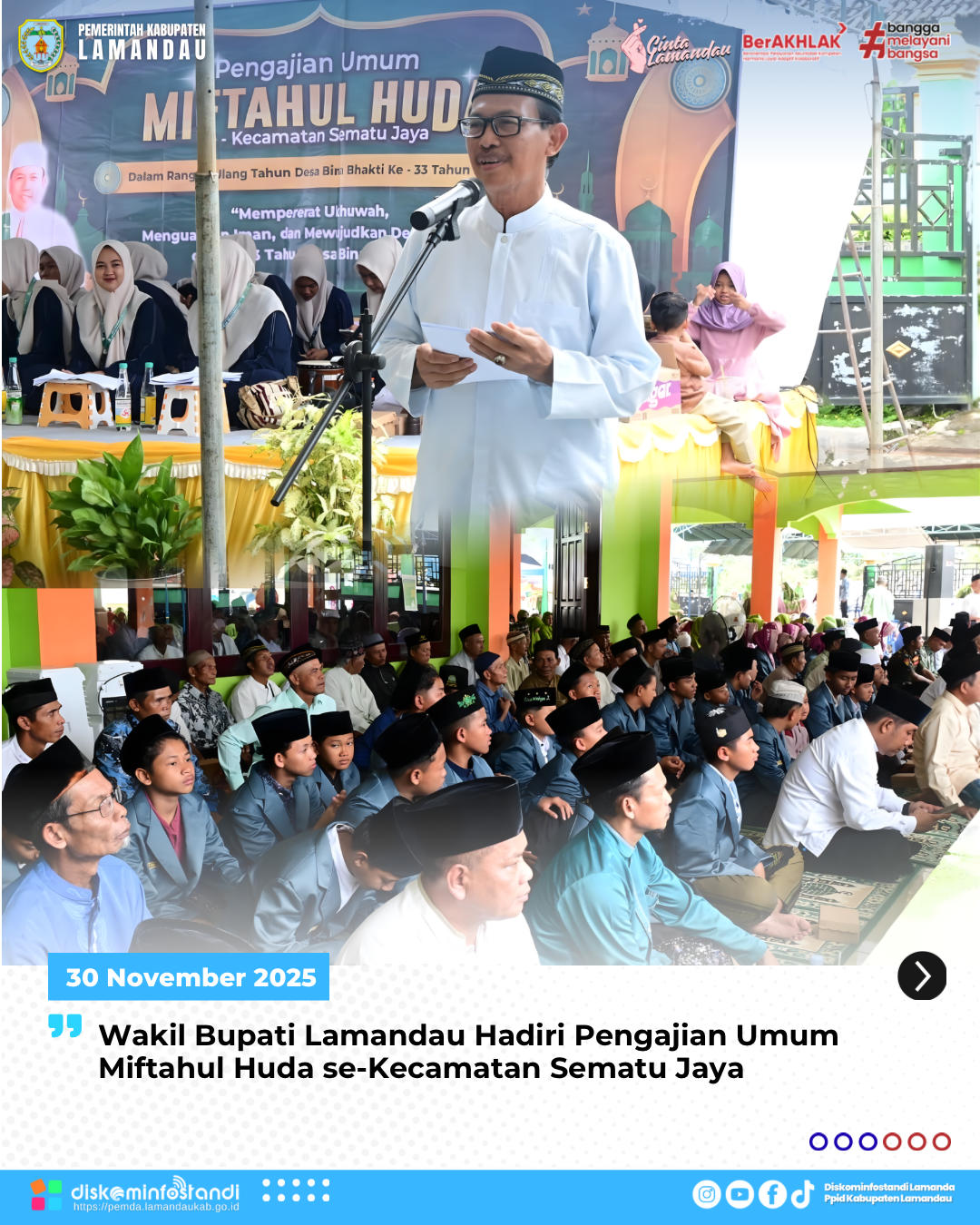 Bina Bhakti – Wakil Bupati Lamandau, Abdul Hamid, menghadiri Pengajian Umum Miftahul Huda se-Kecamatan Sematu Jaya yang digelar di Masjid Nurul Hikmah, Desa Bina Bhakti, Minggu (30/11/2025). Kegiatan ini menghadirkan penceramah utama Guru Besar UIN Palangka Raya sekaligus Direktur Pascasarjana, Prof. Dr. H. Abdul Helim, S.Ag., M.Ag.