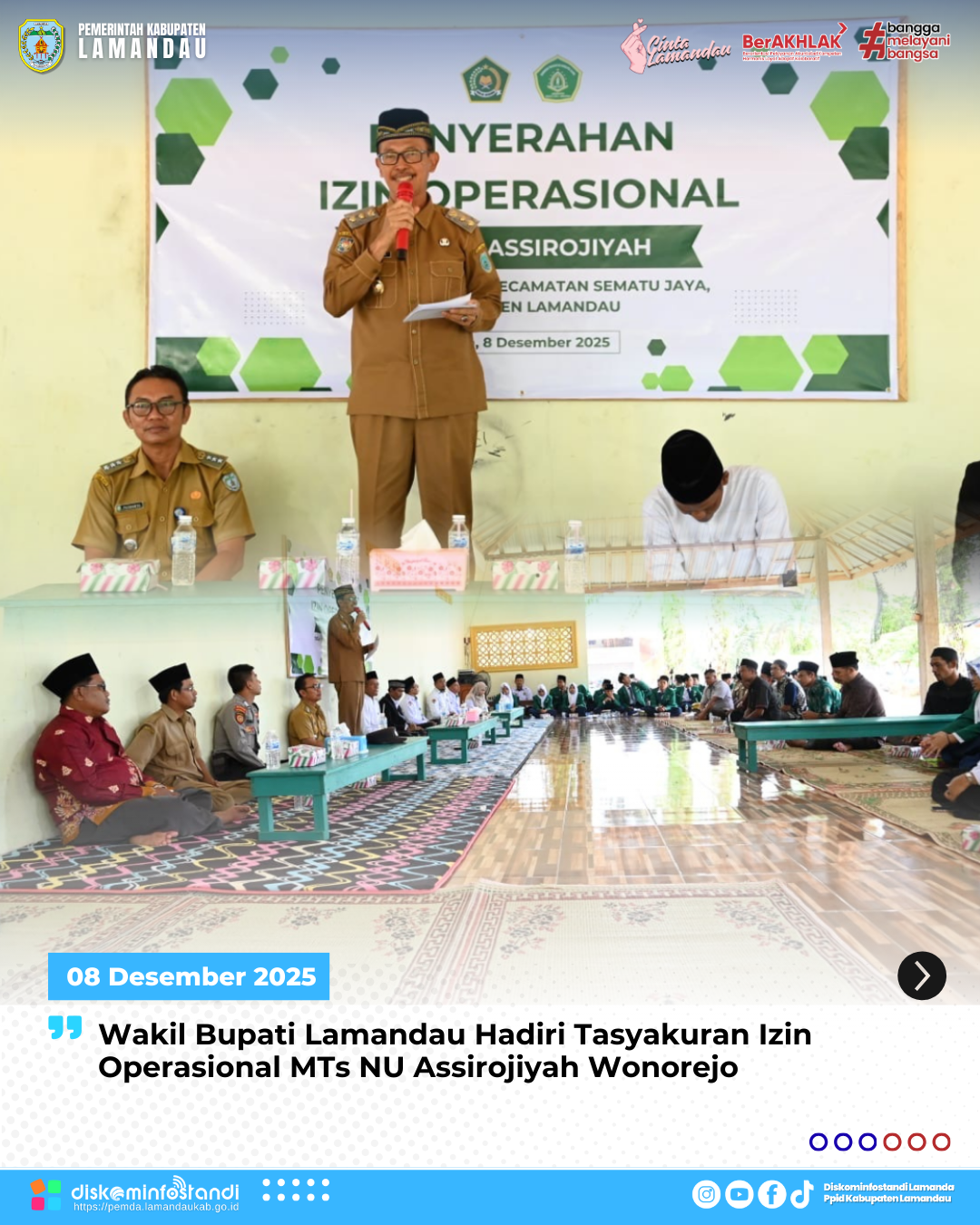 Pemerintah Kabupaten Lamandau, lanjutnya, menyambut baik kehadiran MTs NU Assirojiyah sebagai lembaga pendidikan yang diyakini mampu memberikan kontribusi penting bagi pembangunan sumber daya manusia. Ia menegaskan bahwa pendidikan adalah investasi jangka panjang yang sangat menentukan masa depan daerah.