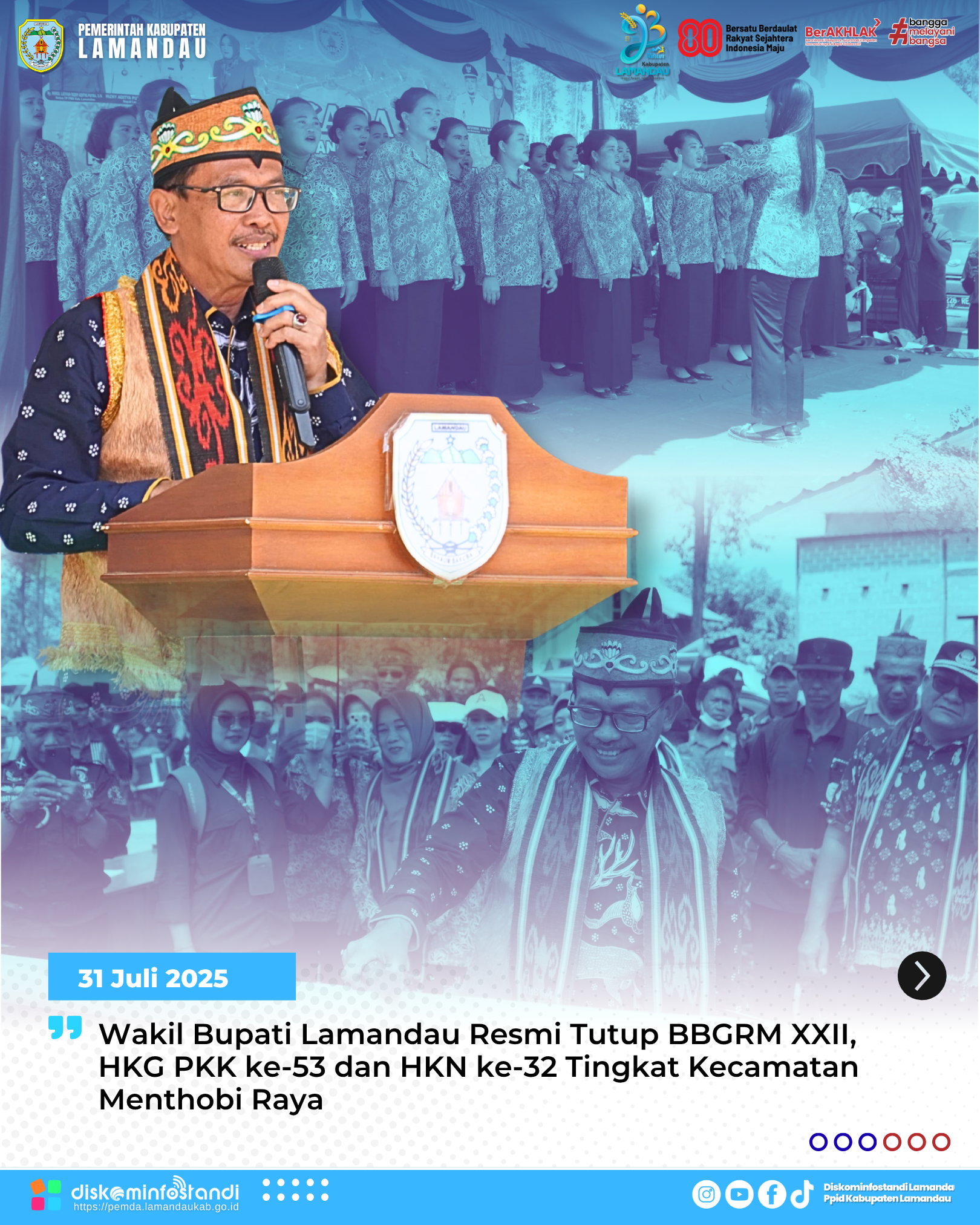 Topalan — Wakil Bupati Lamandau, Abdul Hamid, secara resmi menutup kegiatan Bulan Bhakti Gotong Royong Masyarakat (BBGRM) XXII, Hari Kesatuan Gerak (HKG) PKK ke-53, dan Hari Keluarga Nasional (HKN) ke-32 tingkat Kecamatan Menthobi Raya pada hari Kamis (31/7/2027) di Desa Topalan.