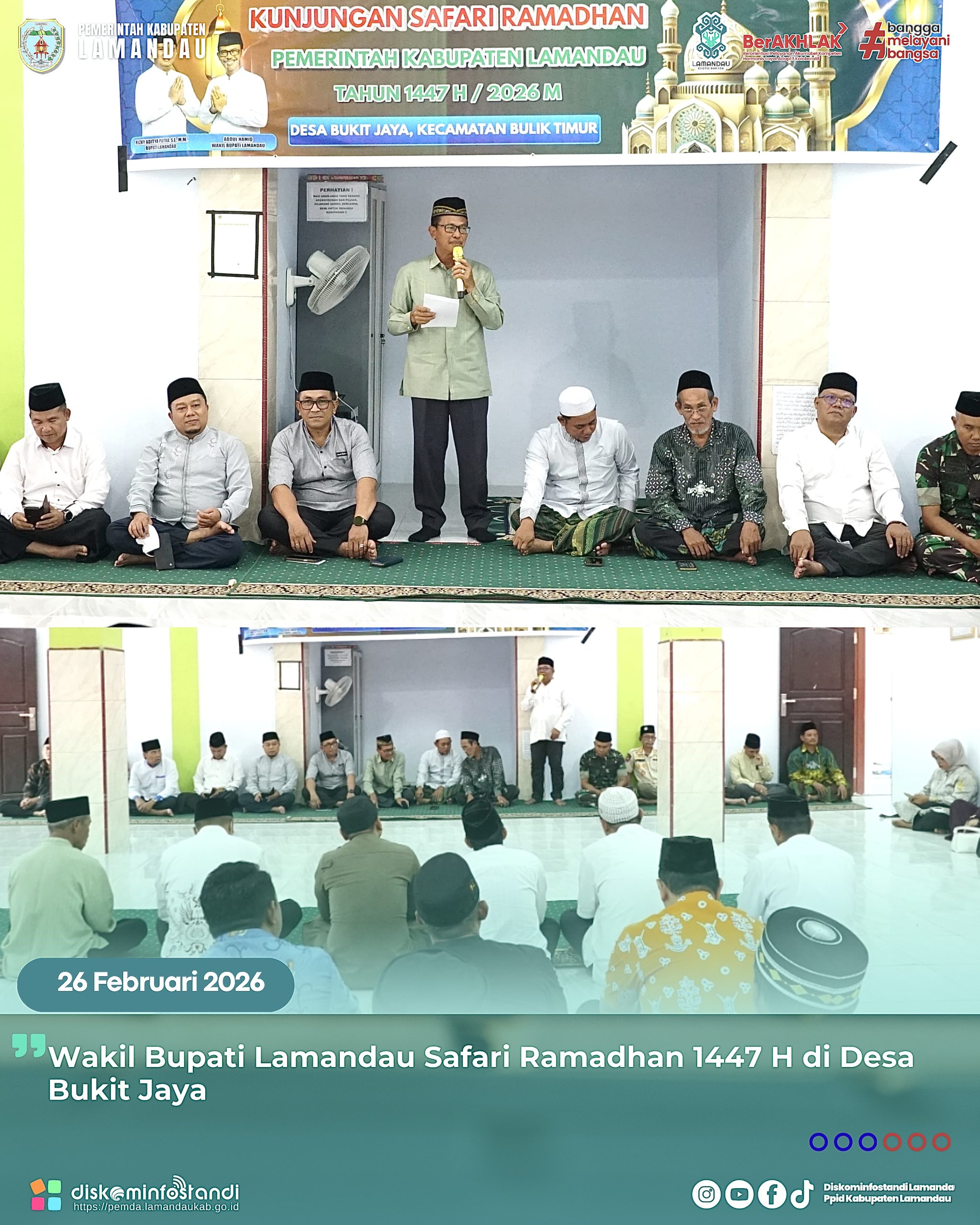 Nanga Bulik – Pemerintah Kabupaten Lamandau menggelar Safari Ramadhan 1447 H di Desa Bukit Jaya, Kecamatan Bulik Timur, Kamis (26/2/2026). Kegiatan yang dilaksanakan di Mushollah Mifthaus Sa’adah tersebut dihadiri langsung oleh Wakil Bupati Lamandau, Abdul Hamid bersama Kepala OPD dan Camat Bulik Timur.