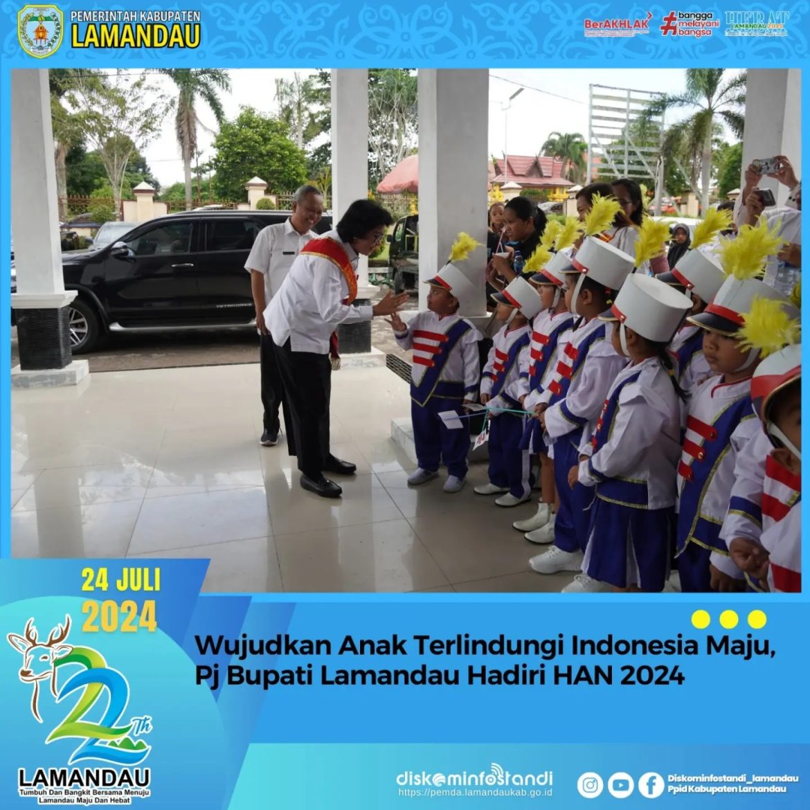 Peringatan HAN tahun ini mengangkat tema “Anak Terlindungi, Indonesia Maju!”, dihadiri oleh perwakilan seluruh sekolah baik Negeri maupun swasta, di Kabupaten Lamandau dengan menampilkan pertunjukan seni dan kreatifitas anak-anak didiknya.
