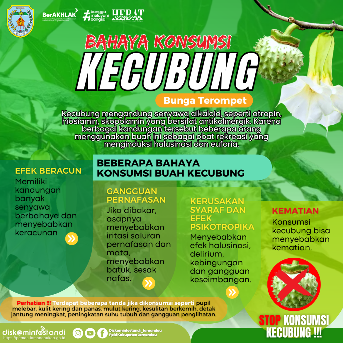 Kecubung (Datura sp.) atau disebut sebagai bunga terompet adalah tanaman semak yang memiliki bunga menyerupai terompet berwarna putih atau ungu, serta buah yang berbentuk bulat dan berduri. Ternyata buah kecubung mengandung senyawa alkaloid, seperti atropin, hiosiamin, skopolamin yang bersifat antikolinergik. Karena berbagai kandungan tersebut beberapa orang menggunakan buah ini sebagai obat rekreasi yang menginduksi halusinasi dan euforia. Beberapa bahaya konsumsi buah kecubung antara lain : efek keracunan, gangguan pernafasan, kerusakan syaraf dan efek psikotropika serta dapat menyebabkan kematian. untuk itu dihimbau kepada seluruh masyarakat untuk menghindari mengkonsumsi buah kecubung. (Diskominfostandi)