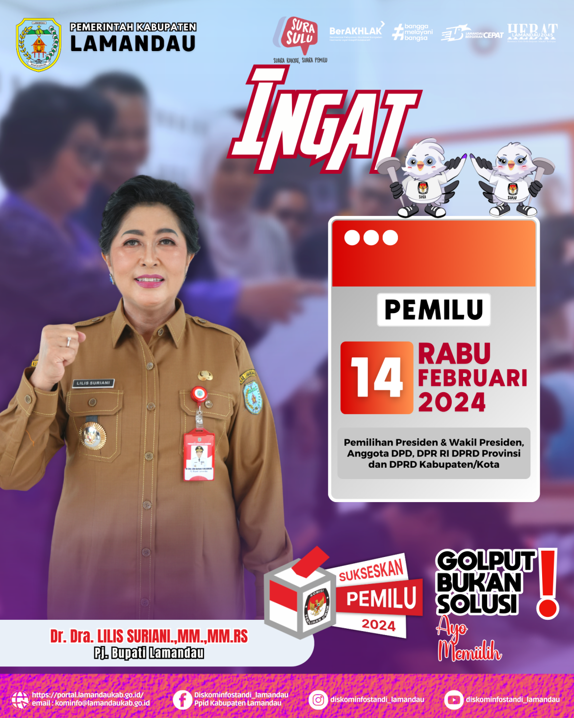 HimbauanAYO MEMILIH !!! by Admin Kominfo Januari 17, 2024 Januari 17, 2024 118INGAT!! Tanggal 14 Februari 2024 datang ke TPS gunakan hak pilihmu, untuk memilih Presiden & Wakil Presiden, Anggota DPD, DPR RI, DPRD Provinsi dan DPRD Kabupaten.Golput Bukan Solusi Ayo memilih. 0 comments 0 FacebookTwitterPinterestEmail previous post Pj Bupati Lamandau Bersama Wakapolda Kalteng Tinjau Kesiapan Pemilu 2024 next post Pj Bupati Lamandau Monitoring Persiapan Pelaksanaan Pemilu di Kecamatan Bulik dan Sematu Jaya Related Articles Survei Kepuasan Masyarakat Pelayanan PPID Tahun 2025 September 24, 2025 Waspada Banjir dan Tanah Longsor September 12, 2025 Diberitahukan Modus Penipuan mengatasnamakan Ketua DPRD Kabupaten Lamandau Agustus 6, 2025 Kibarkan Bendera Merah Putih sebagai Rasa Cinta Tanah... Agustus 1, 2025 Informasi Hoax Periode Januari-Juli 2025 Juli 8, 2025 Cara Mengenali Hoax dan Melawannya !! Juli 8, 2025 STOP HOAX !! Juli 1, 2025 Himbauan Mutasi KTP dan Kartu Keluarga kepada seluruh... Mei 19, 2025 Hoax mengatasnamakan Pj. Bupati Lamandau Said Salim Februari 7, 2025 Penegasan Netralitas Aparatur Sipil Negara Dalam Penyelenggaraan Pemilihan... September 2, 2024Leave a Comment Cancel ReplySave my name, email, and website in this browser for the next time I comment.