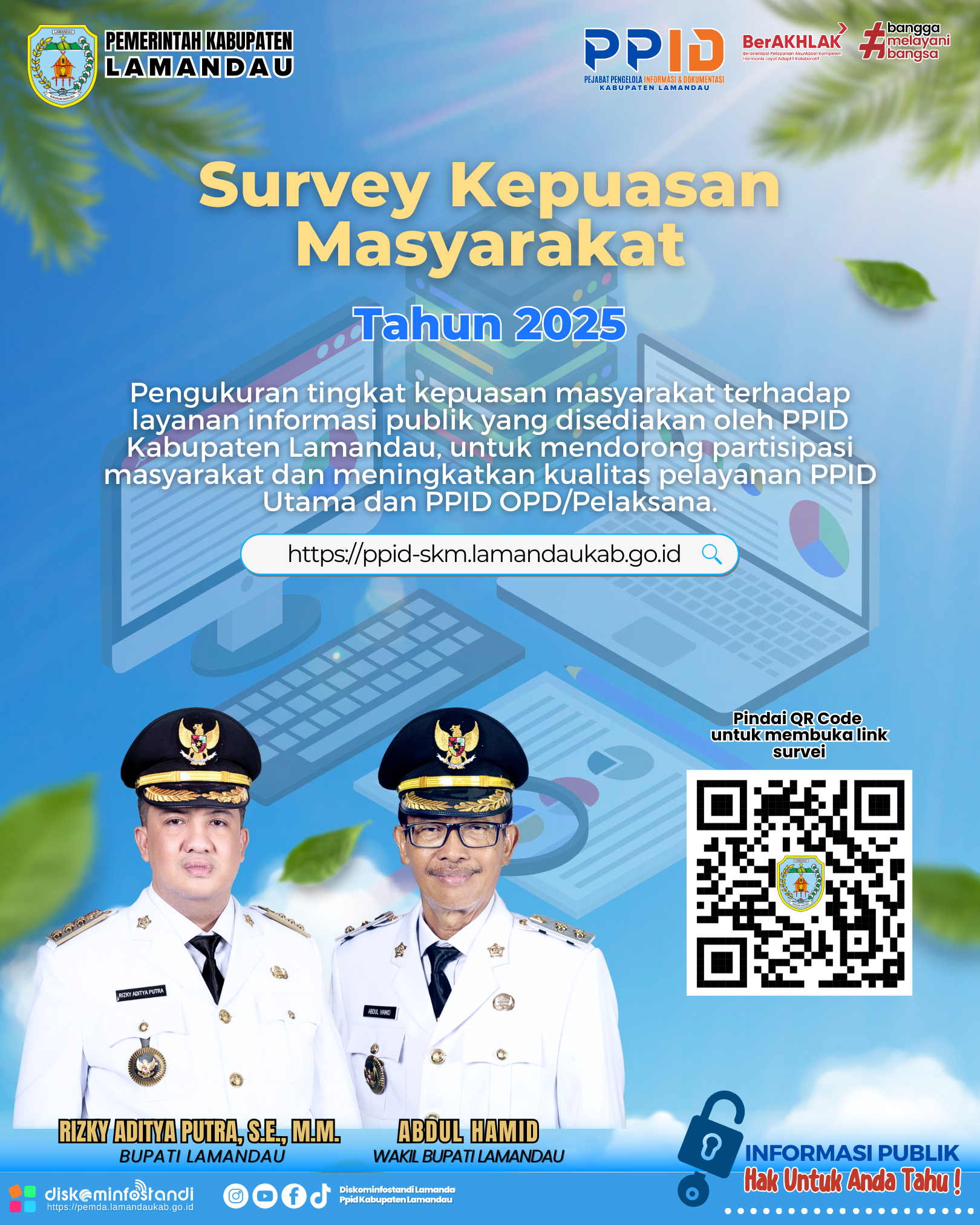 Dalam rangka pengukuran tingkat kepuasan masyarakat terhadap layanan informasi publik Pemerintah Kabupaten Lamandau melalui PPID Kabupaten Lamandau, untuk mendorong partisipasi masyarakat dan meningkatkan kualitas pelayanan PPID Utama dan PPID OPD/Pelaksana, silahkan berpartsipasi dalam survei kepuasan dimaksud dengan cara scan barcode yang tertera pada flyer. Terima kasih atas partisipasinya meluangkan waktu untuk mengisi kuesioner ini, atau melalui link berikut : https://ppid-skm.lamandaukab.go.id