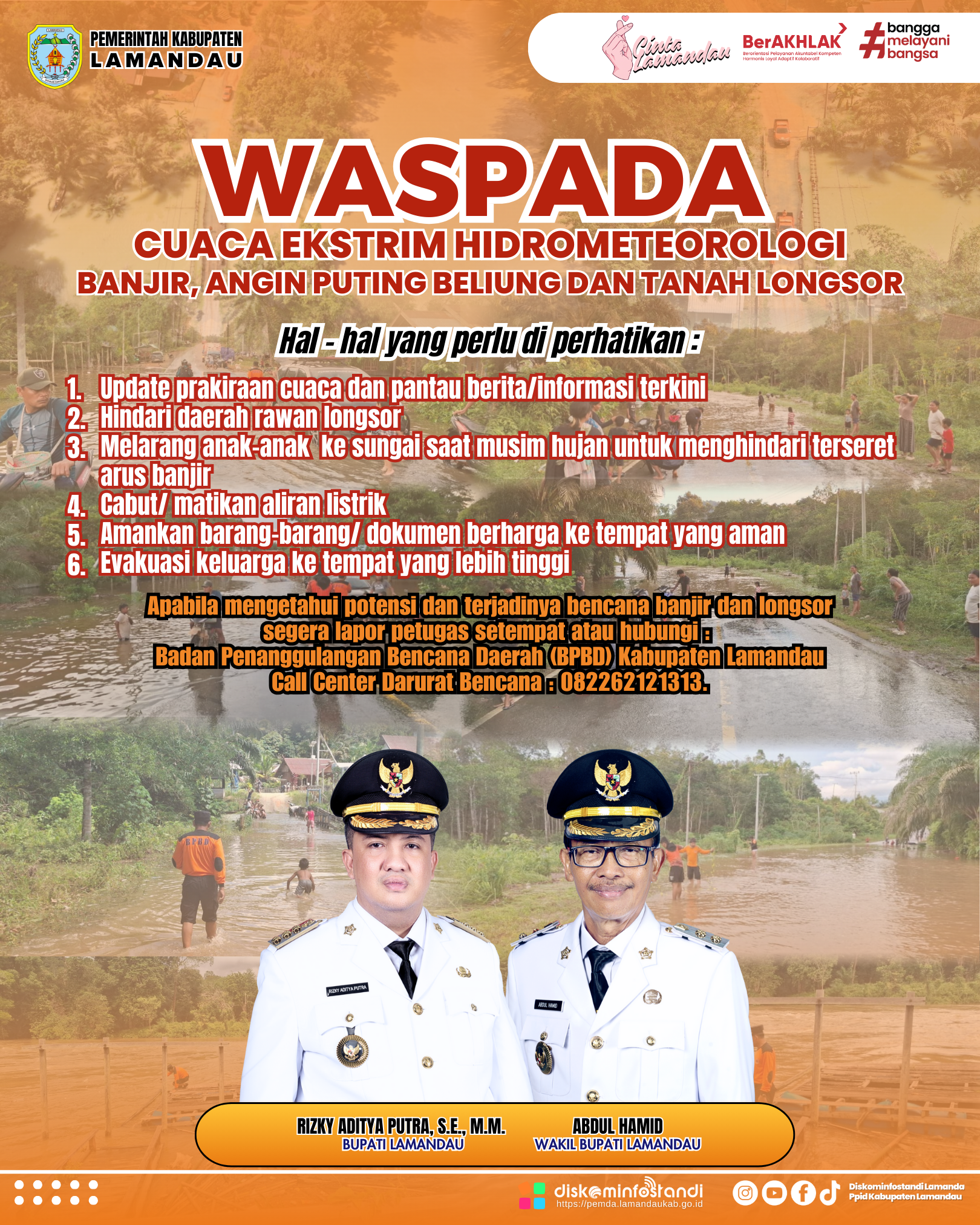 Waspada Banjir dan Tanah Longsor, dengan ini dihimbau kepada seluruh masyarakat Lamandau : 1. Update prakiraan cuaca dan pantau berita/informasi terkini 2. Hindari daerah rawan longsor 3. Melarang anak-anak ke sungai saat musim hujan untuk menghindari terseret arus banjir 4. Cabut/ matikan aliran listrik 5. Amankan barang-barang/ dokumen berharga ke tempat yang aman 6. Evakuasi keluarga ke tempat yang lebih tinggi Apabila mengetahui potensi dan terjadinya bencana banjir dan longsor segera lapor petugas setempat atau hubungi : Badan Penanggulangan Bencana Daerah (BPBD) Kabupaten Lamandau Call Center Darurat Bencana : 082262121313.