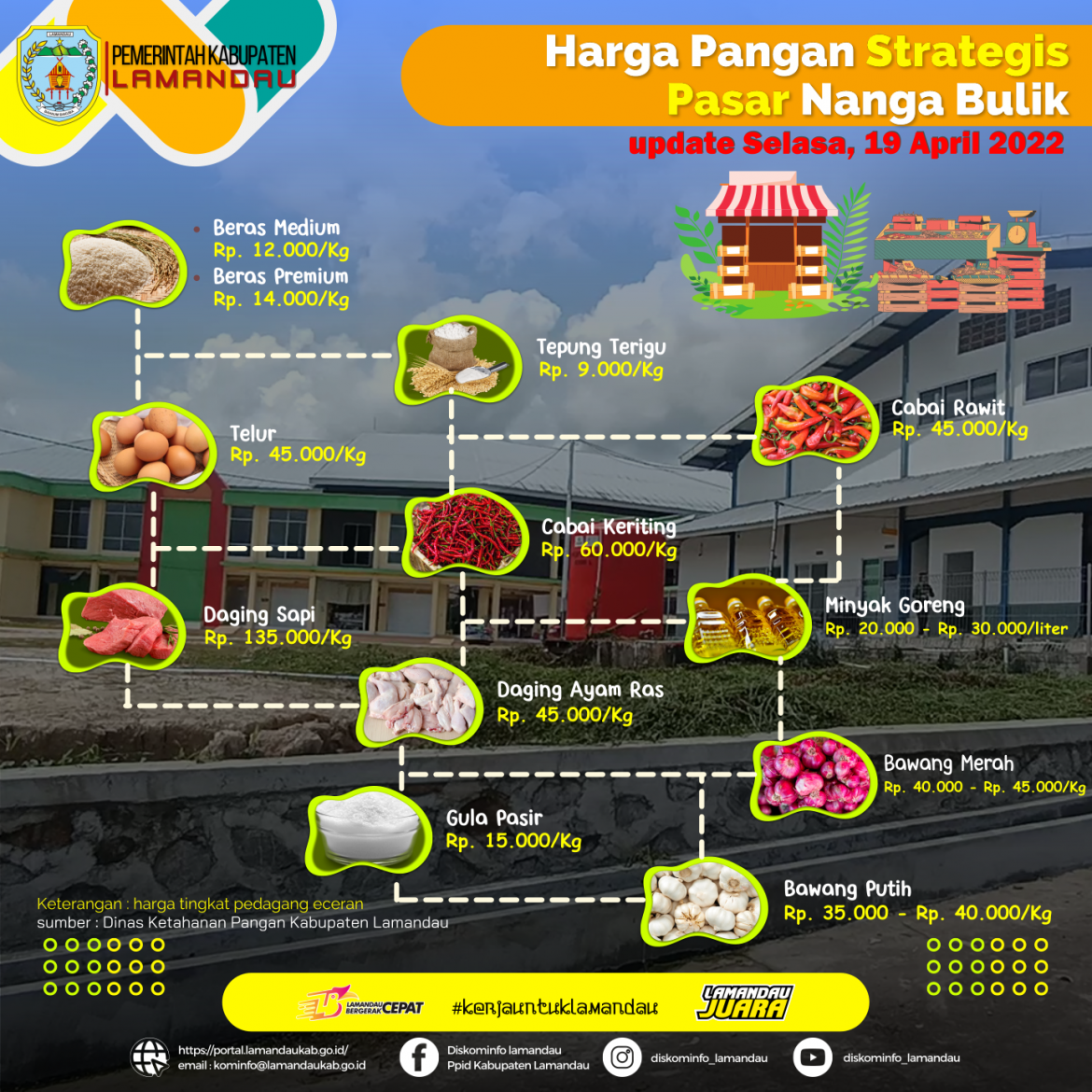 Lamandau – Daftar Harga Pangan Tingkat Pedagang Eceran per 19 April 2022 Kabupaten Lamandau terpantau stabil (0,00%).