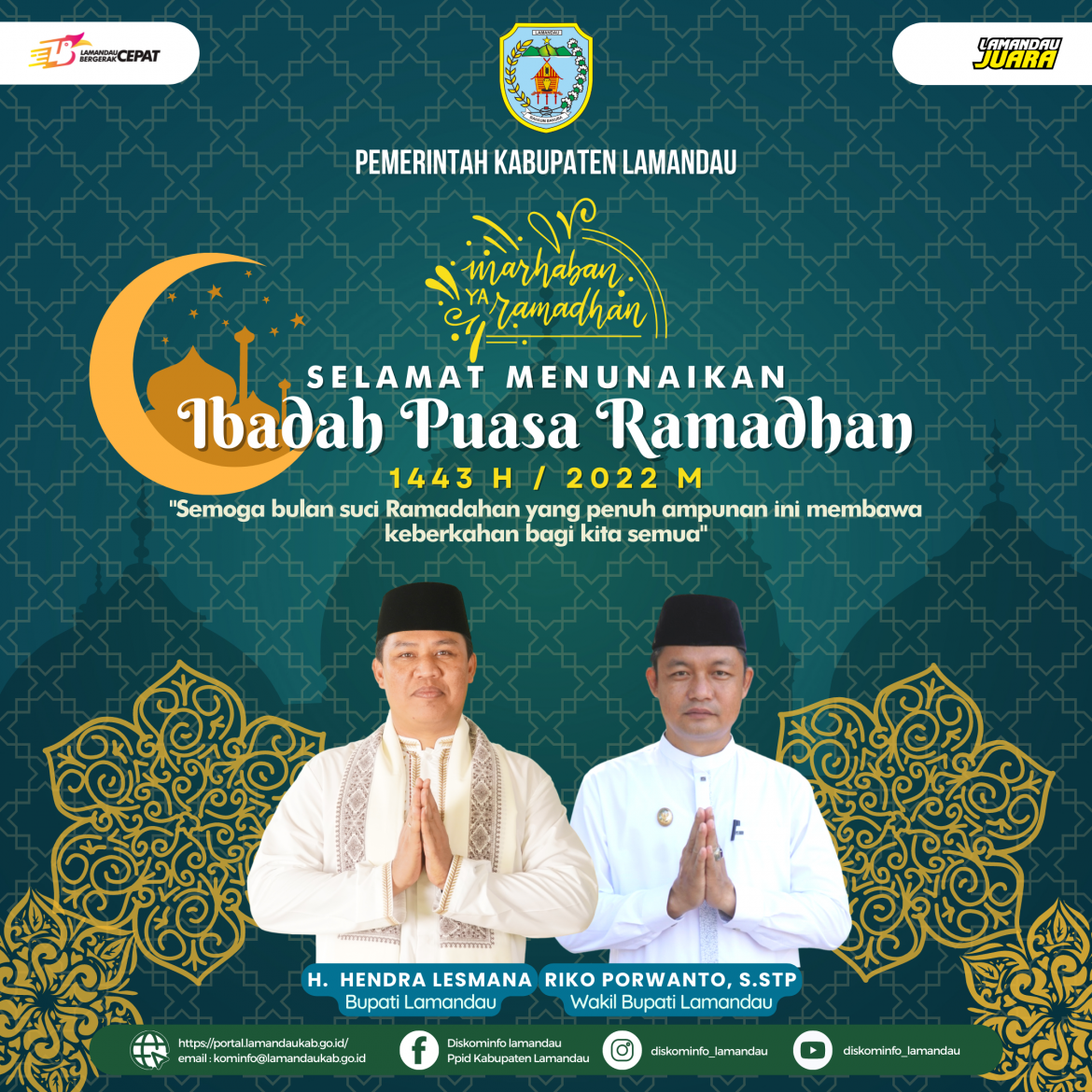Lain-lainUcapan PemdaPEMERINTAH KABUPATEN LAMANDAU MENGUCAPKAN SELAMAT MENUNAIKAN IBADAH PUASA RAMADHAN 1443 H /2022 M by Admin Kominfo April 7, 2022 April 7, 2022 90“Semoga Bulan Suci Ramadhan 1443 H Yang Penuh Ampunan Membawa Berkah Bagi Kita Semua” 0 comments 0 FacebookTwitterPinterestEmail previous post Harga Pangan (07 April 2022) next post Bupati Hadiri Musyawarah Perencanaan Pembangunan (MUSRENBANG) RKPD Provinsi Kalimantan Tengah Tahun 2023 Related Articles Uji Publik Keterbukaan Informasi Publik Tahun 2025 Oktober 15, 2025 Survei Kepuasan Masyarakat Pelayanan PPID Tahun 2025 September 24, 2025 Selamat Hari Jadi ke-66 Kabupaten Barito Selatan September 21, 2025 Selamat dan Sukses (MTQH) XII Tingkat Kabupaten Lamandau... September 20, 2025 Selamat Ulang Tahun Bapak Abdul Hamid ke 57... September 12, 2025 Turut Berduka Cita Atas Wafatnya Pangeran Muasjidinsyah Agustus 18, 2025 Selamat Ulang Tahun ke-53 Gubernur Kalimantan Tengah Bapak... Agustus 17, 2025 Dirgahayu ke-80 Kemerdekaan Republik Indonesia Agustus 17, 2025 Selamat Hari Pramuka ke-64 Tahun Agustus 14, 2025 Diberitahukan Modus Penipuan mengatasnamakan Ketua DPRD Kabupaten Lamandau Agustus 6, 2025Leave a Comment Cancel ReplySave my name, email, and website in this browser for the next time I comment.
