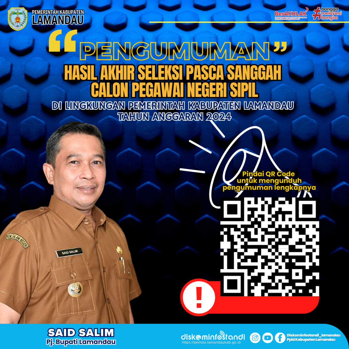 Berikut disampaikan Pengumuman Hasil Akhir Seleksi Pasca Sanggah Calon Pegawai Negeri Sipil di Lingkungan Pemerintah Kabupaten Lamandau Tahun Anggaran 2024. Pindai QR Code untuk mengunduh pengumuman lengkapnya atau klik link : https://drive.google.com/file/d/1OSlAF8D4BbAqMgtIJ6J8TAF_ArgZUuRU/view. (Diskominfostandi)