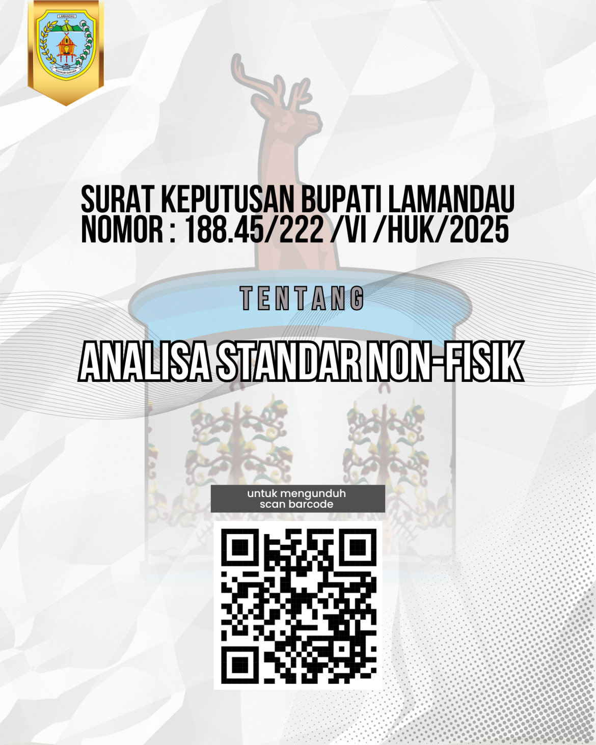 Surat Keputusan Bupati Lamandau Nomor : 188.45/222 /VI /HUK/2025 tentang Analisa Standar Non-Fisik, link unduh : https://pemda.lamandaukab.go.id/download/surat-keputusan-bupati-lamandau-nomor-188-45-222-vi-huk-2025-tentang-analisa-standar-non-fisik/