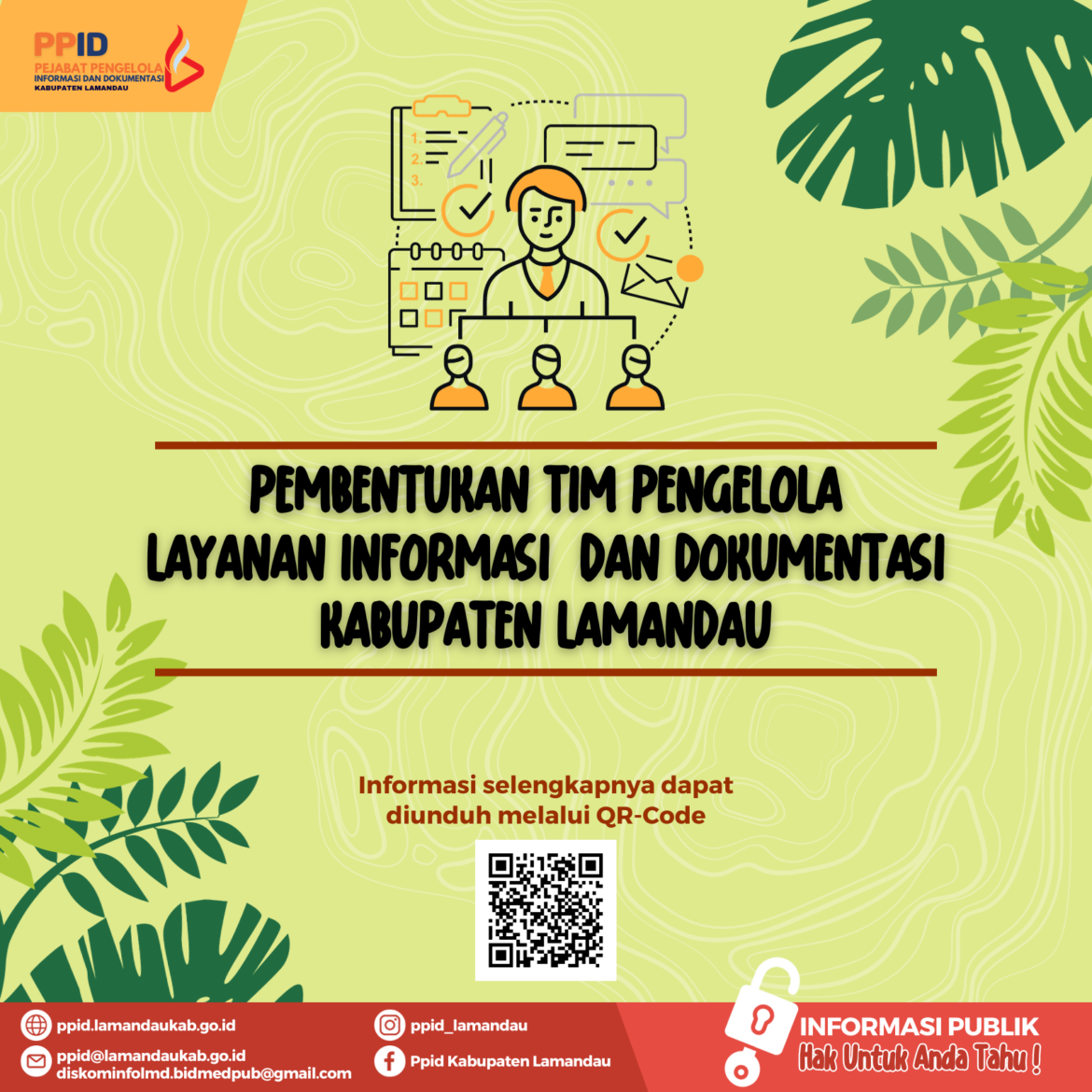 Pembentukan Tim Pengelola Layanan Informasi dan Dokumentasi Kabupaten Lamandau, dapat diunduh melalui link : http://ppid.lamandaukab.go.id/front/dokumen/detail/300247970 atau scan Qr-Code