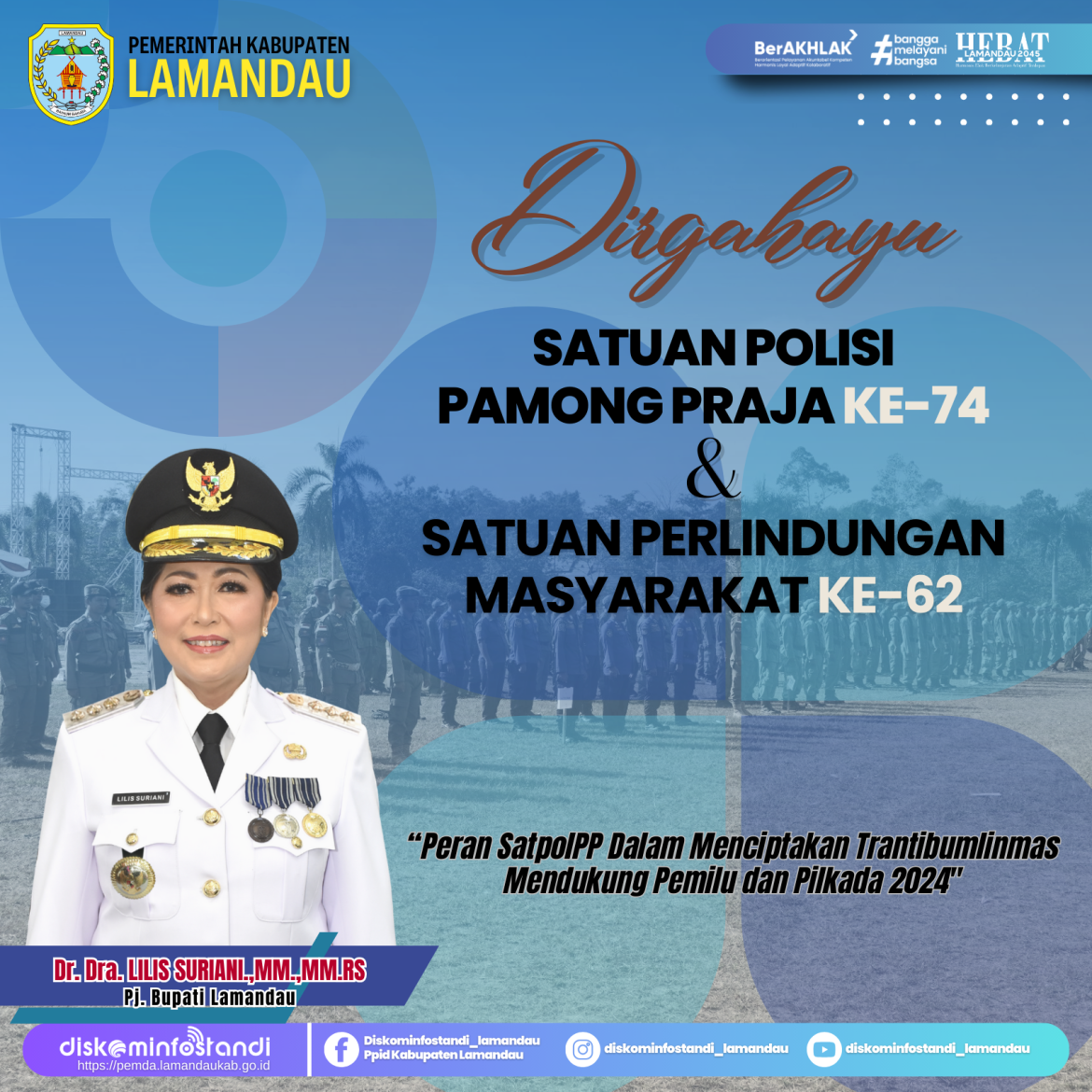 Ucapan PemdaDirgahayu SatpolPP ke-74 dan Satlinmas ke-62 by Admin Kominfo Maret 3, 2024 Maret 3, 2024 24Pemerintah Kabupaten Lamandau mengucapkan Dirgahayu Satuan Polisi Pamong Praja KE-74 dan Satuan Perlindungan Masyarakat ke-62.โPeran SatpolPP dalam Menciptakan Trantibumlinmas Mendukung Pemilu dan Pilkada 2024″ 0 comments 0 FacebookTwitterPinterestEmail previous post Pj Bupati Lamandau Menutup Resmi Turnamen Voli Bupati Cup III Tahun 2024 next post Jaga Stabilitas Harga Pangan, Pemkab Lamandau Gelar Pasar Murah Related Articles Selamat Hari Jadi ke-66 Kabupaten Barito Selatan September 21, 2025 Selamat dan Sukses (MTQH) XII Tingkat Kabupaten Lamandau... September 20, 2025 Selamat Ulang Tahun Bapak Abdul Hamid ke 57... September 12, 2025 Turut Berduka Cita Atas Wafatnya Pangeran Muasjidinsyah Agustus 18, 2025 Selamat Ulang Tahun ke-53 Gubernur Kalimantan Tengah Bapak... Agustus 17, 2025 Dirgahayu ke-80 Kemerdekaan Republik Indonesia Agustus 17, 2025 Selamat Hari Pramuka ke-64 Tahun Agustus 14, 2025 Selamat Hari Jadi ke-23 Kabupaten Lamandau Agustus 3, 2025 Selamat dan Sukses atas terselenggaranya Mubes I Dayak... Juli 28, 2025 Selamat Hari Anak Nasional Tahun 2025 Juli 23, 2025Leave a Comment Cancel ReplySave my name, email, and website in this browser for the next time I comment.