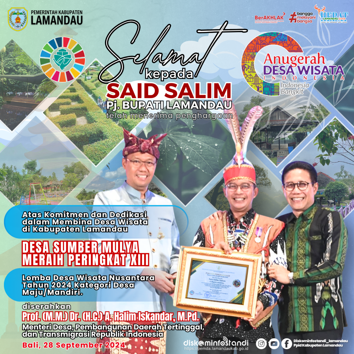 Selamat kepada Pj. Bupati Lamandau, SAID SALIM telah menerima penghargaan atas komitmen dan dedikasi dalam membina desa wisata di Kabupaten Lamandau, sehingga Desa Sumber Mulya Meraih Peringkat ke-13 Lomba Desa Wisata Nusantara Tahun 2024 Kategori Desa Maju/Mandiri, diserahkan oleh Prof. (M.M.) Dr. (H.C.) A. Halim Iskandar, M.Pd. Menteri Desa, Pembangunan Daerah Tertinggal, dan Transmigrasi Republik Indonesia. Bali, 28 September 2024. (Diskominfostandi)