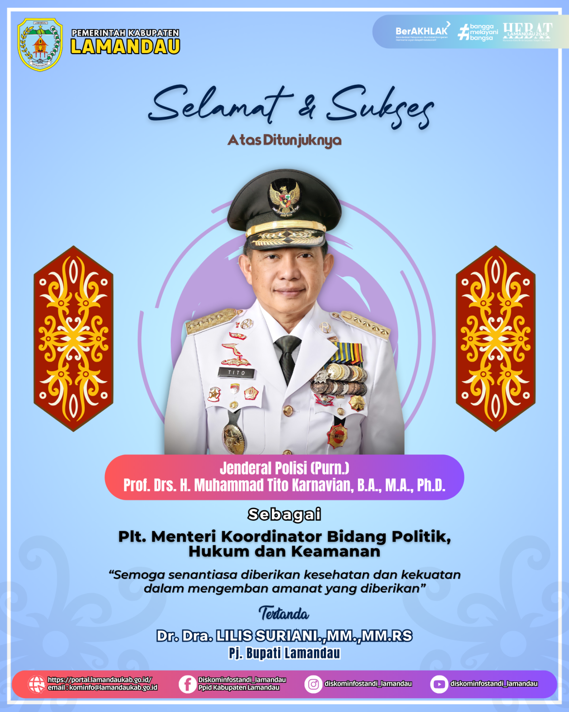 Pemerintah Kabupaten Lamandau mengucapkan Selamat dan Sukses atas ditunjuknya Jenderal Polisi (Purn.) Prof. Drs. H. Muhammad Tito Karnavian, B.A., M.A., Ph.D. sebagai Plt. Menteri Koordinator Bidang Politik, Hukum dan Keamanan.