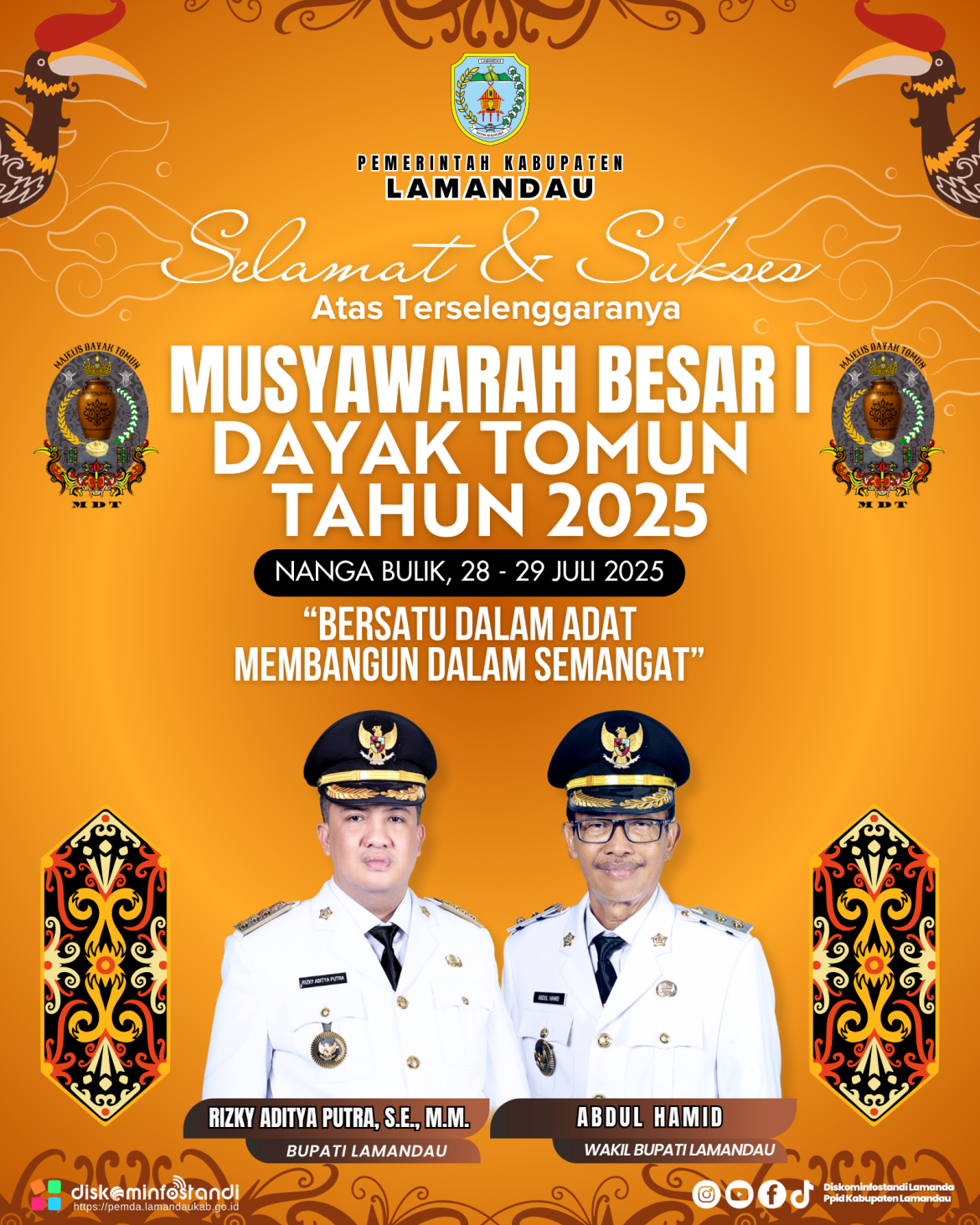 Pemerintah Kabupaten Lamandau mengucapkan Selamat dan Sukses atas terselenggaranya Musyawarah Besar I Dayak Tomun Tahun 2025. Nanga Bulik, 28 – 29 Juli 2025. “Bersatu Dalam Adat, Membangun Dalam Semangat”