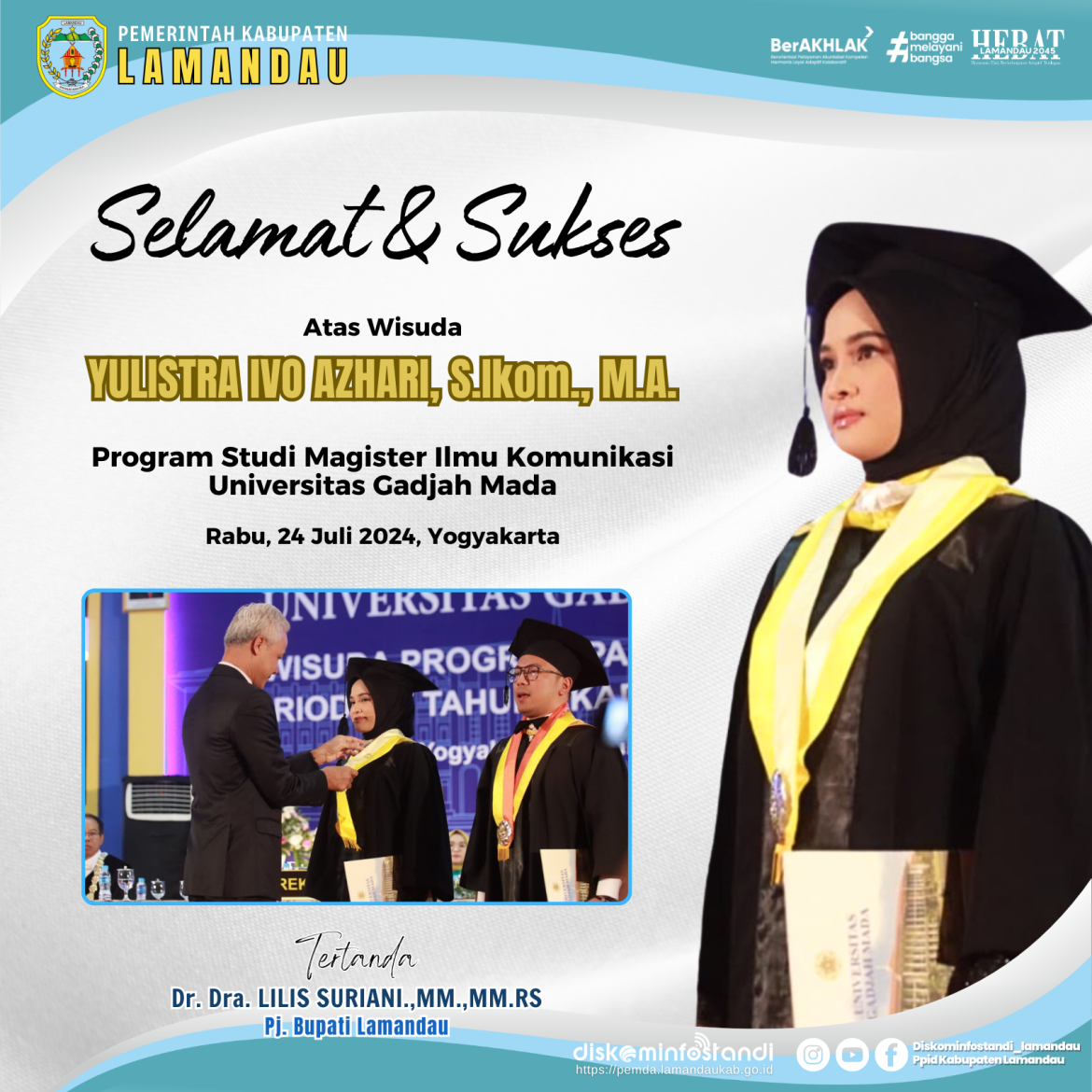 Selamat dan Sukses Atas Wisuda Yulistra Ivo Azhari, S.Ikom., M.A. Program Studi Magister Ilmu Komunikasi Universitas Gadjah Mada Rabu, 24 Juli 2024 Yogyakarta