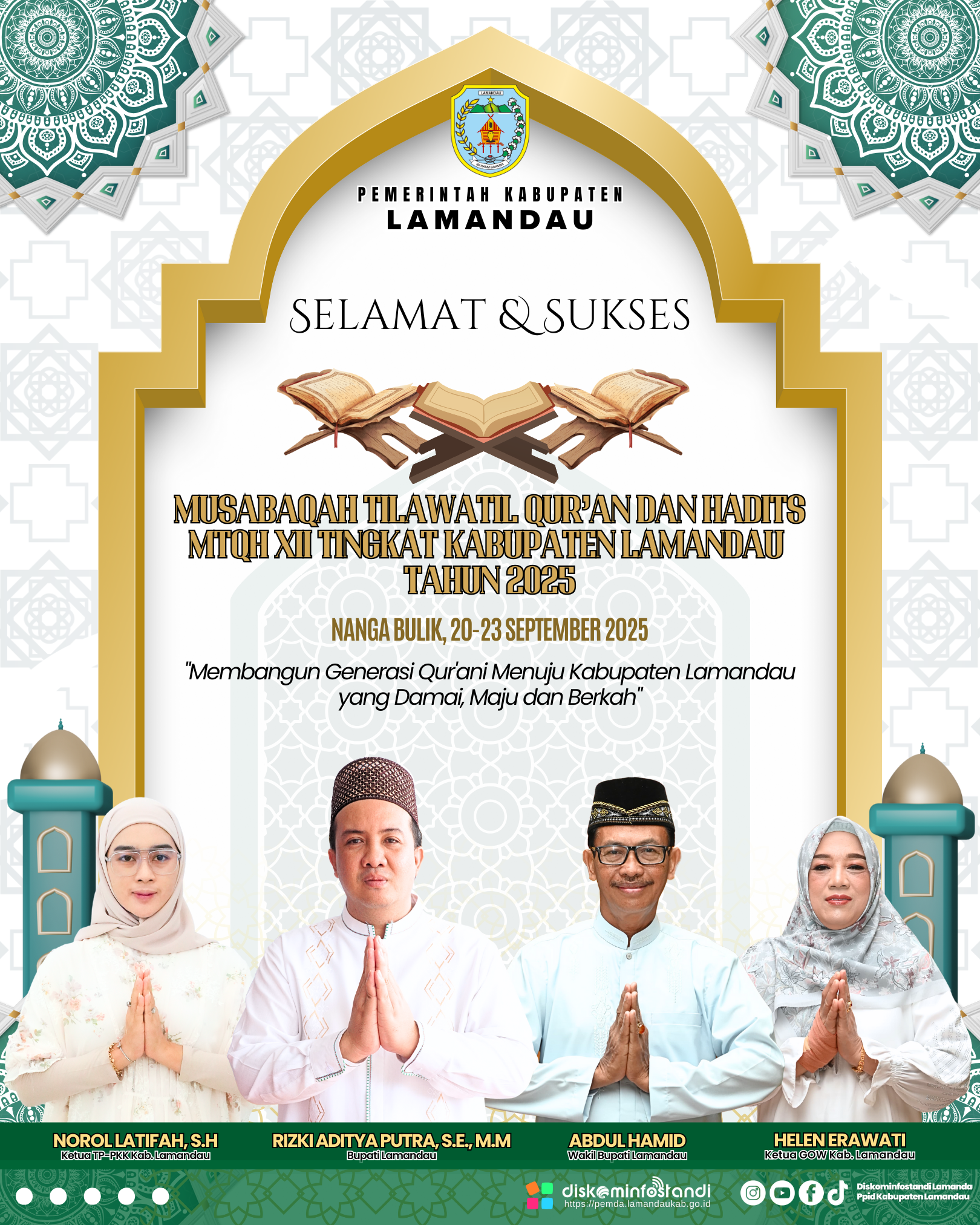 Selamat dan Sukses atas terselenggaranya Musabaqah Tilawatil Qur’an dan Hadits (MTQH) XII Tingkat Kabupaten Lamandau Tahun 2025. Di Nanga Bulik, 20 – 23 September 2025 “Membangun Generasi Qur’ani Menuju Kabupaten Lamandau yang Damai, Maju dan Berkah””