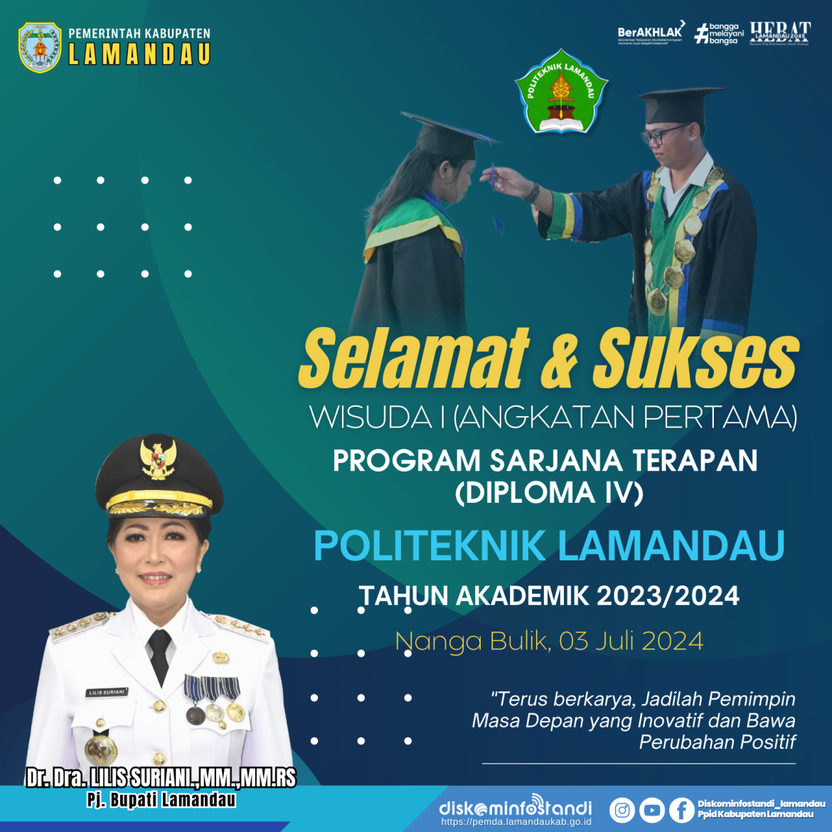 Pemerintah Kabupaten Lamandau mengucapkan Selamat dan Sukses pelaksanaan Wisuda I (Angkatan Pertama) Program Sarjana Terapan (Diploma IV) Politeknik Lamandau Tahun Akademik 2023/2024. “Terus berkarya, Jadilah Pemimpin Masa Depan yang Inovatif dan Bawa Perubahan Positif”. Nanga Bulik, 03 Juli 2024