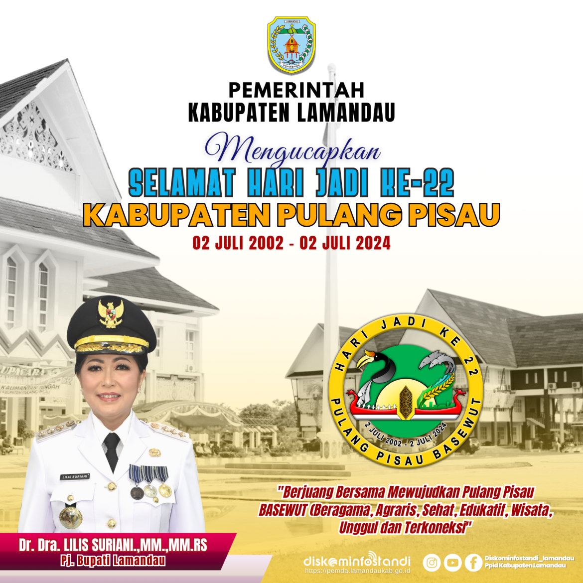 Pemerintah Kabupaten Lamandau mengucapkan Selamat Hari Jadi Kabupaten Pulang Pisau ke-22 Tahun (02 Juli 2002 – 02 Juli 2024) “Berjuang Bersama Mewujudkan Pulang Pisau BASEWUT (Beragama, Agraris, Sehat, Edukatif, Wisata, Unggul dan Terkoneksi”