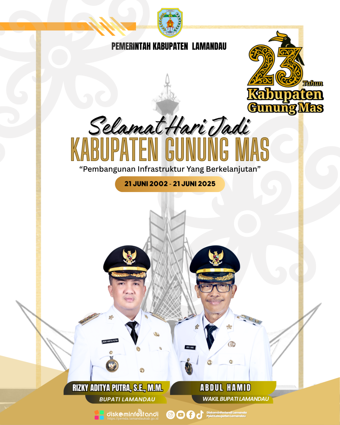 Pemerintah Kabupaten Lamandau mengucapkan Selamat Hari Jadi ke-23 Kabupaten Gunung Mas. 21 Juni 2002 – 21 Juni 2025 “Pembangunan Infrastruktur Yang Berkelanjutan”