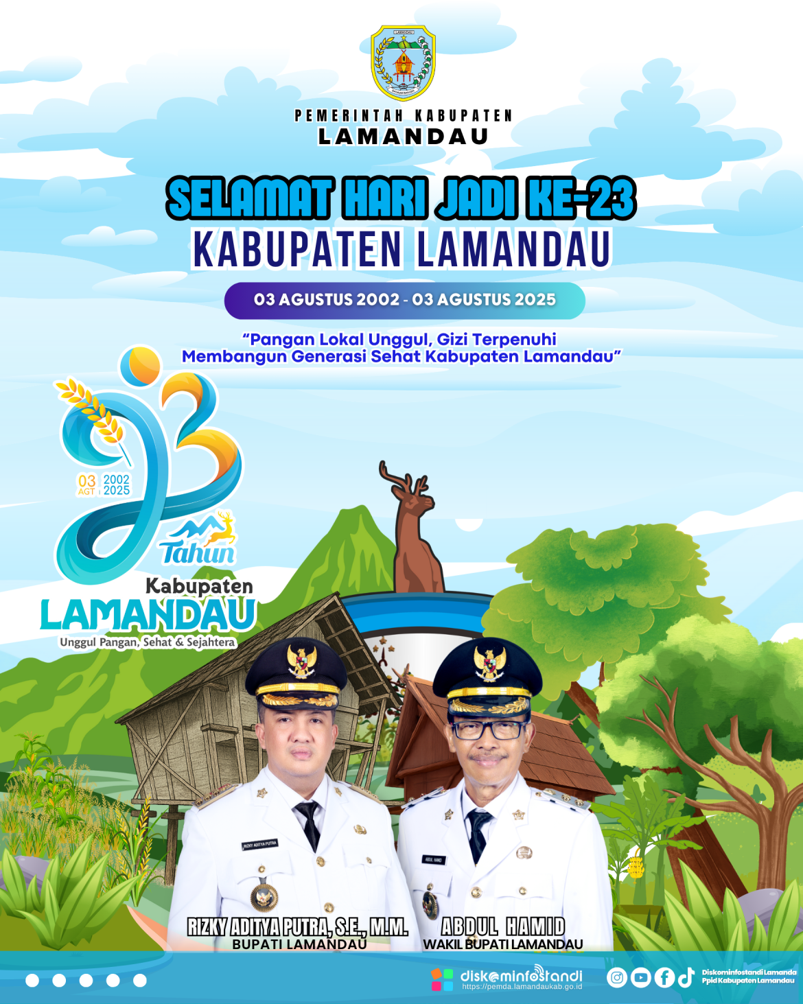 Pemerintah Kabupaten Lamandau mengucapkan Selamat Hari Jadi Kabupaten Lamandau ke-23 (03 Agustus 2002 – 03 Agustus 2025), “Pangan Lokal Unggul, Gizi Terpenuhi Membangun Generasi Sehat Kabupaten Lamandau”, Dengan Semangat Hari Jadi Ke-23 Kabupaten Lamandau, Bersama Kita Perkuat dan Cintai Produk Petani Kita, Penuhi Gizi Keluarga untuk Mewujudkan Lamandau Sehat dan Sejahtera Jayalah Kabupaten Lamandau, Sejaterah Masyarakatnya.